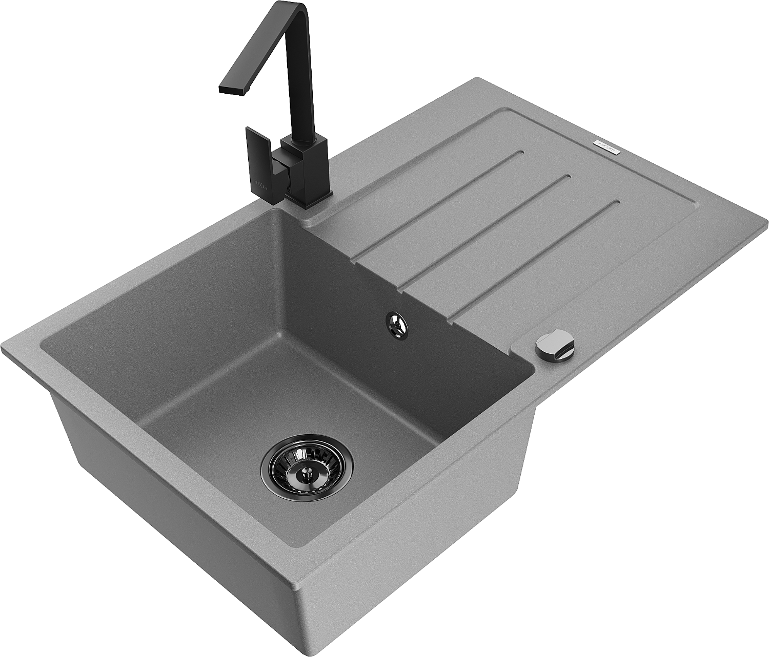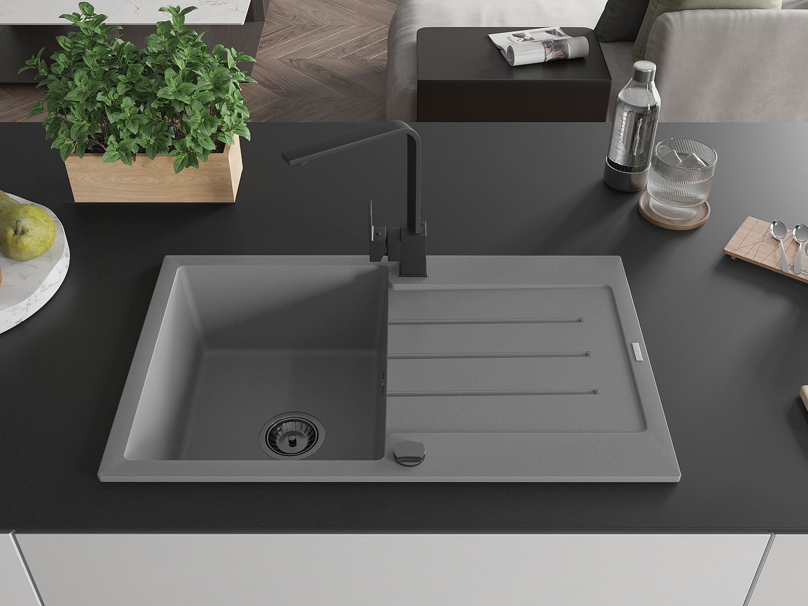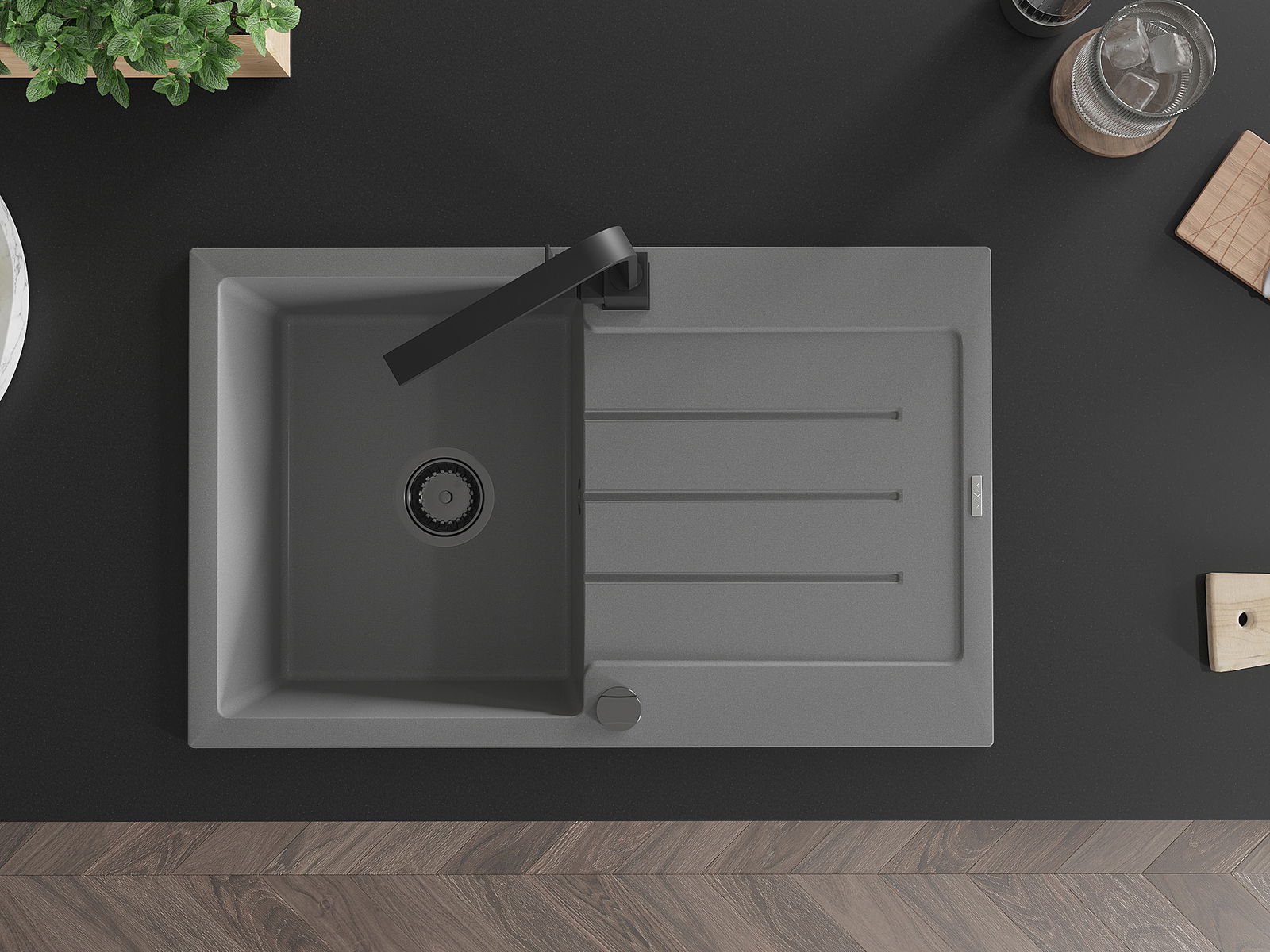 Mexen Bruno žulový kuchynský drez 1-komorový s odkvapkávačom a kuchynskou batériou Rita, sivý - 6513-71-670300-70-B