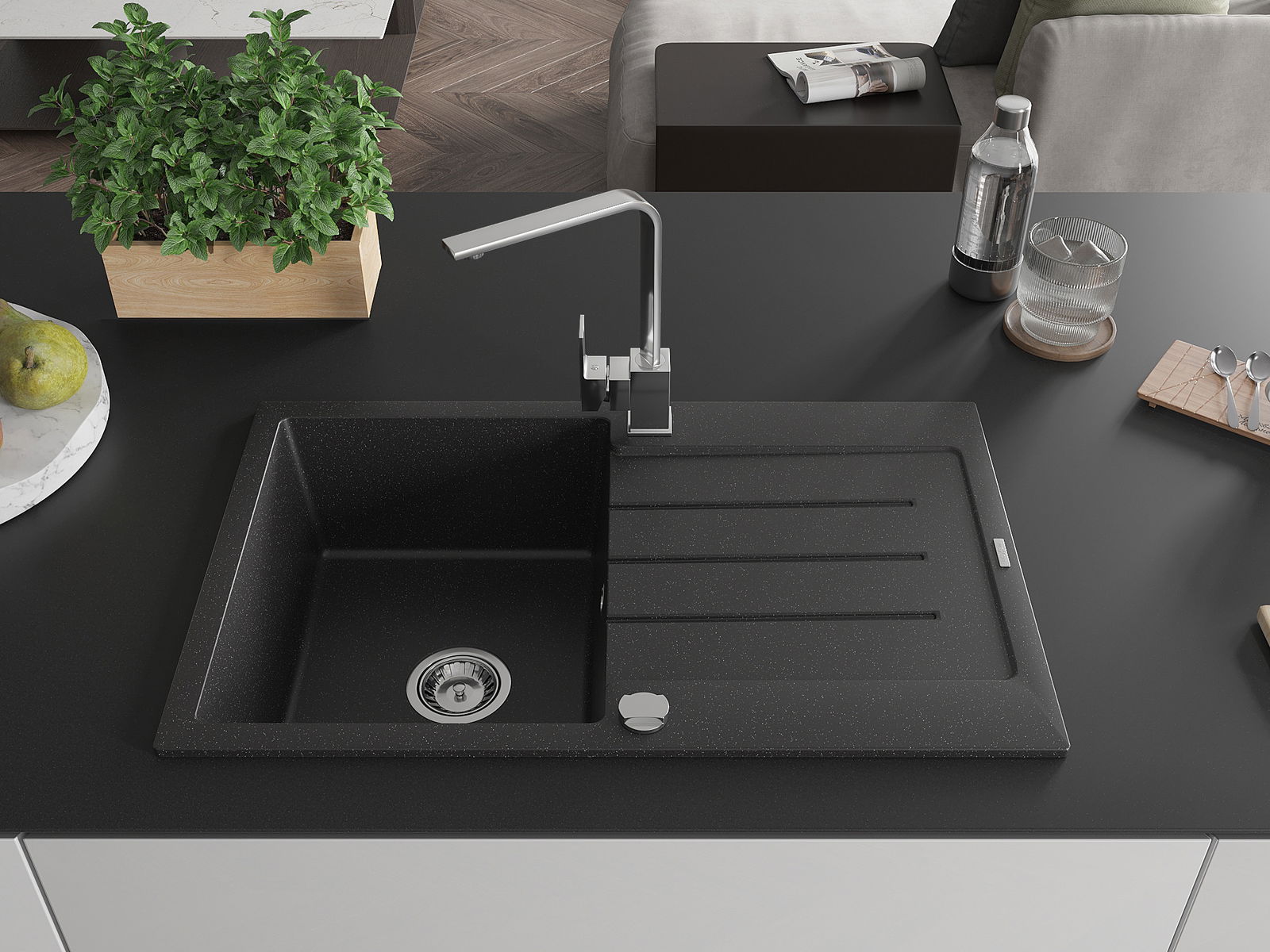 Drez bol vyrobený z vysoko kvalitného granitu. Predstavuje elegantné, ale predovšetkým praktické doplnenie každej kuchyne, nezávisle od jej štýlu. Vysoká kvalita a trvácnosť granitu zaisťujú dlhodobé používanie.