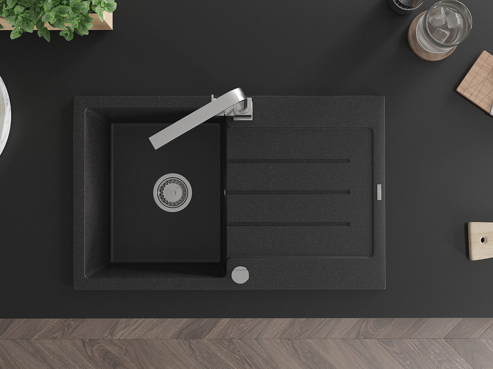 Povrch kuchynského drezu je odolný voči škvrnám a zafarbeniu, vďaka čomu sa ľahko udržiava a zachováva svoju farbu počas dlhého obdobia používania. Estetický a praktický doplnok pre každú kuchyňu.
