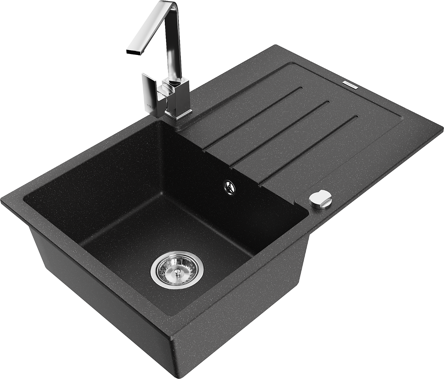 Mexen Bruno jednokomorový granitový drez s odkvapkávačom a kuchynskou batériou Rita, čierna/strieborný metalický
