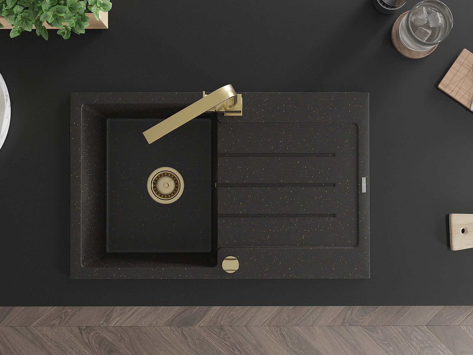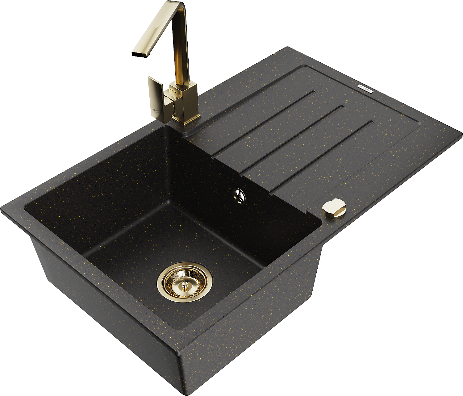 Mexen Bruno granitový jednodrez s odkvapkávacou plochou a kuchynskou batériou Rita, čierny/zlatý metalik