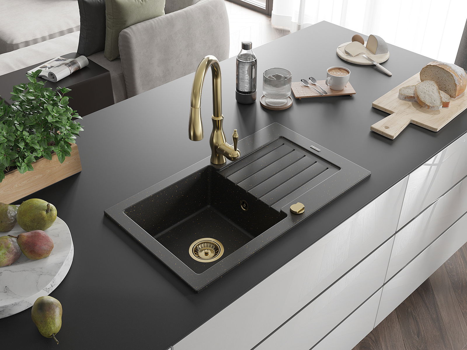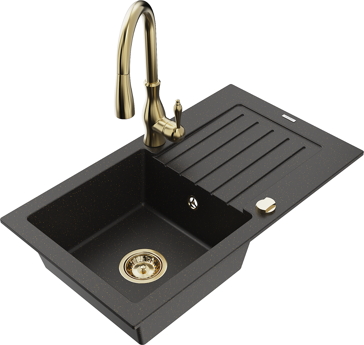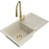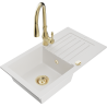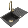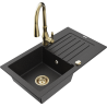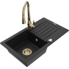 Mexen Pablo jednodrezový žulový drez s odkvapkávačom a kuchynskou batériou Savita, čierny/zlatý metalik