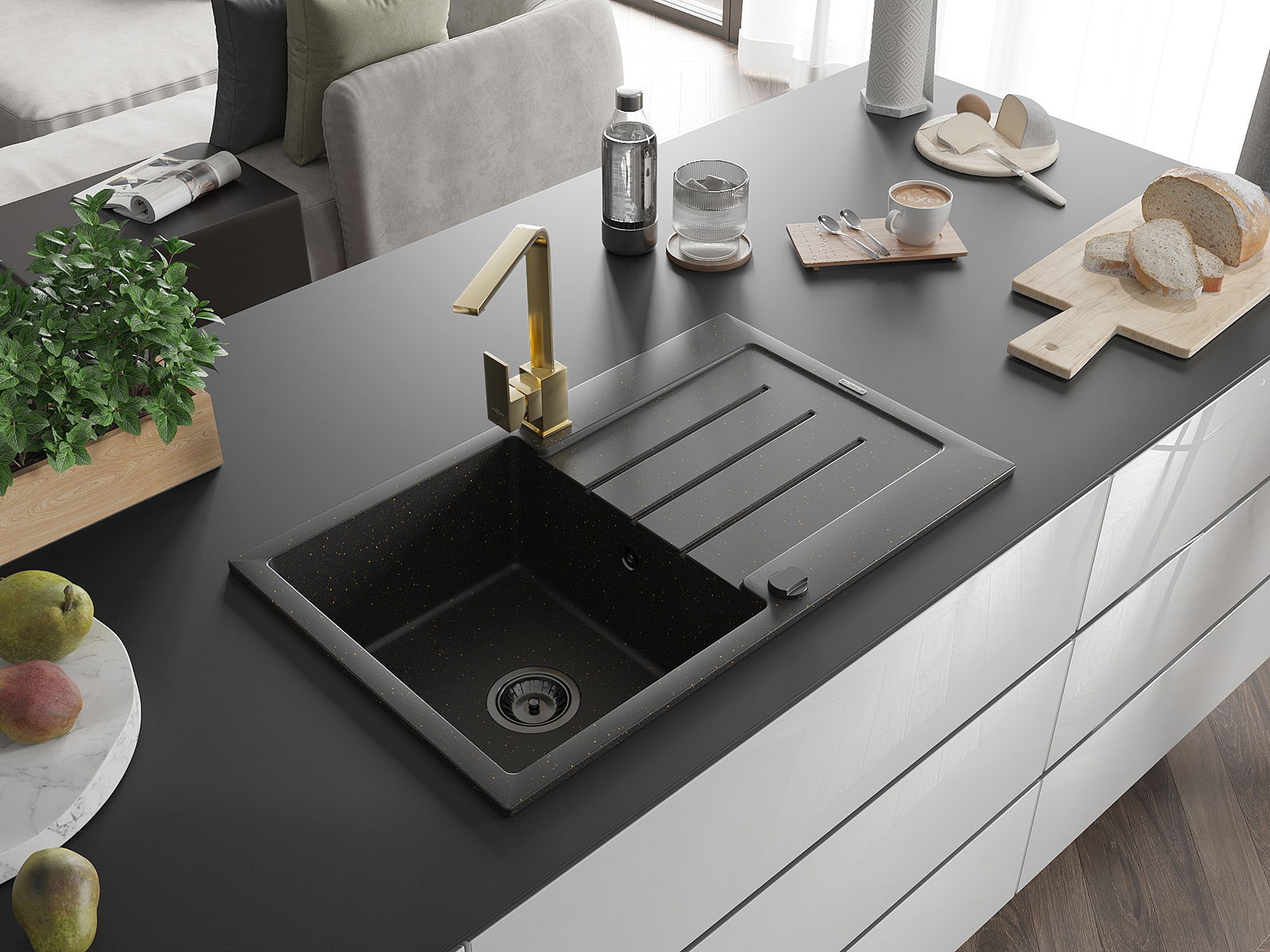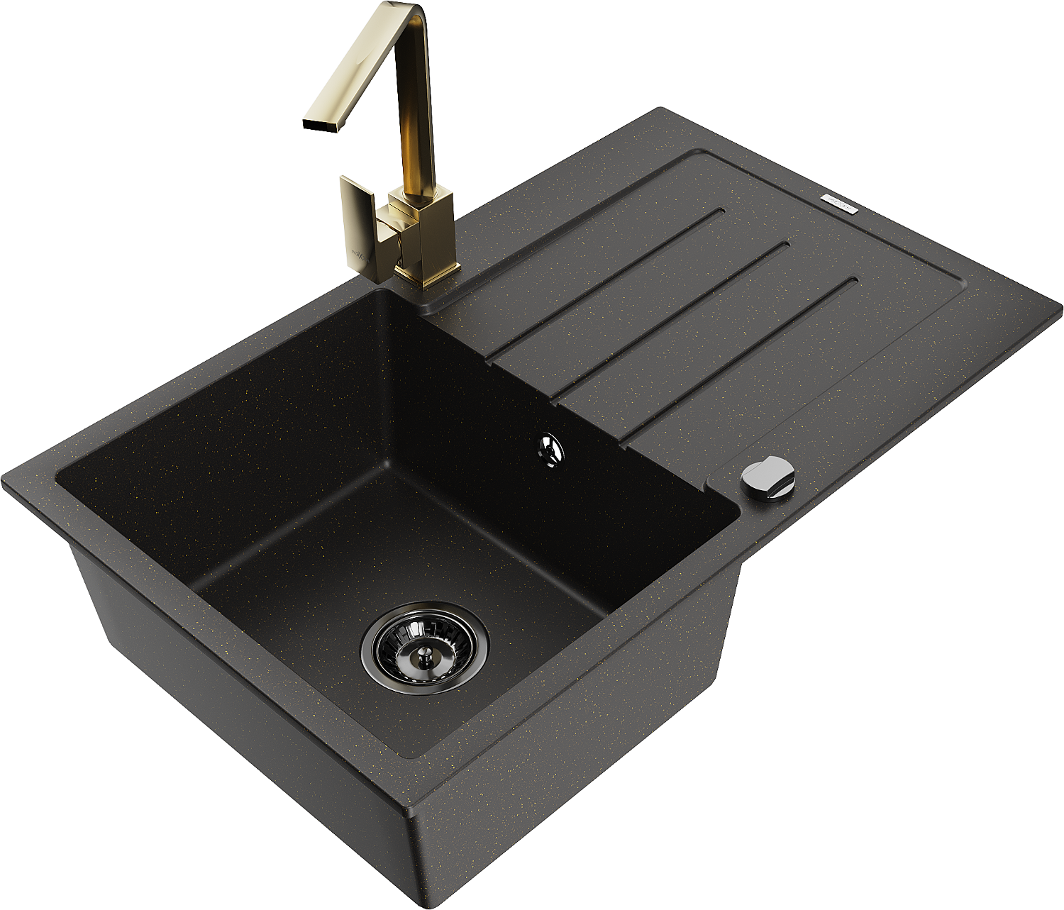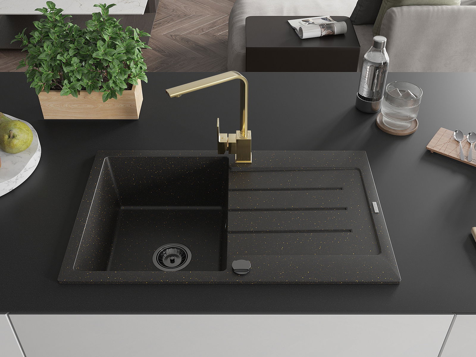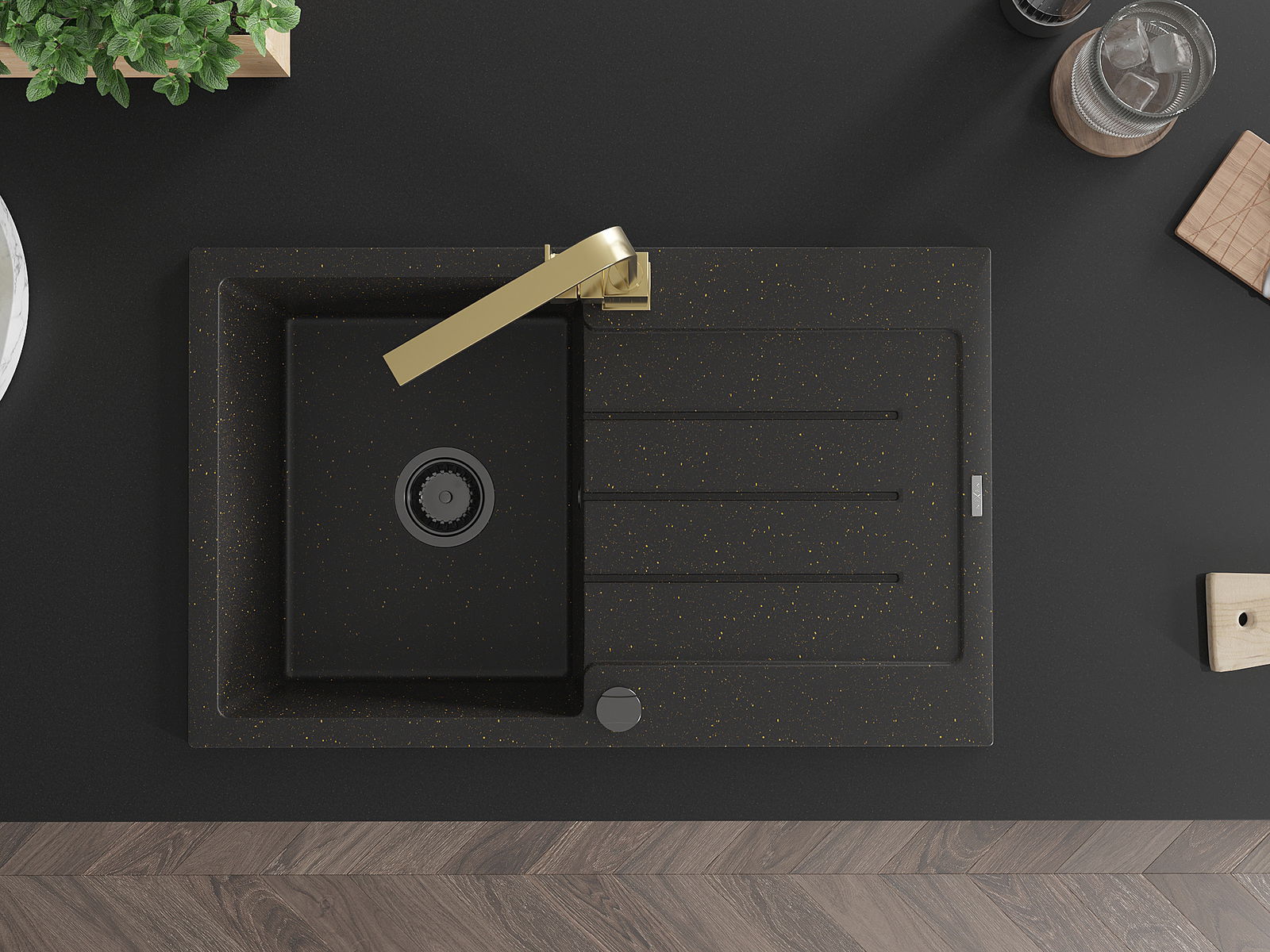 Mexen Bruno jednokomorový granitový drez s odkvapkávačom a kuchynskou batériou Rita, čierny/zlatý metalik - 6513-75-670300-50-B