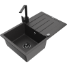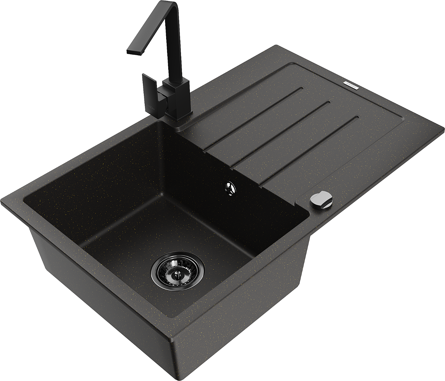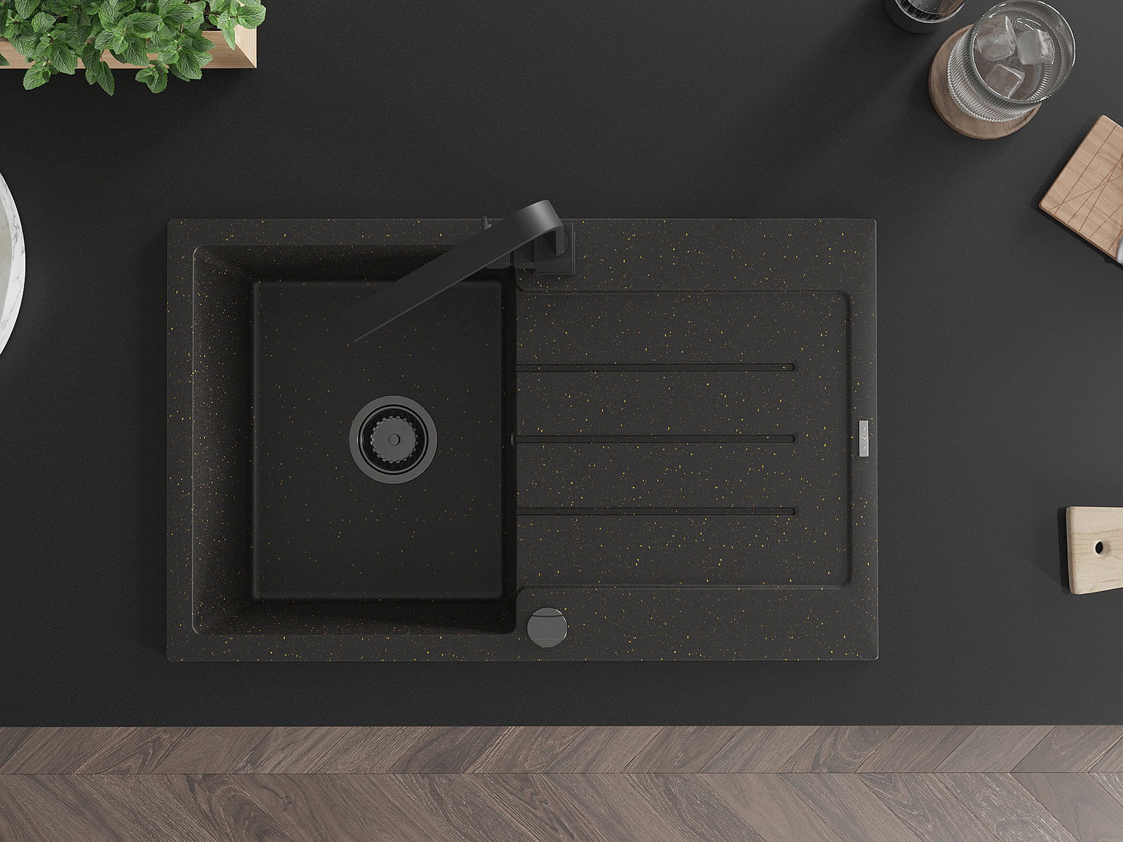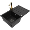 Mexen Bruno jednodrezový granitový drez s odkvapkávačom a kuchynskou batériou Rita, čierny/zlatý metalik