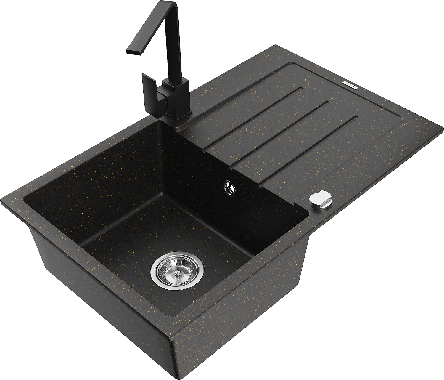 Mexen Bruno Granitový kuchynský drez s jednou komorou s odkapávačom a kuchynskou batériou Rita, čierny/zlatý metalický