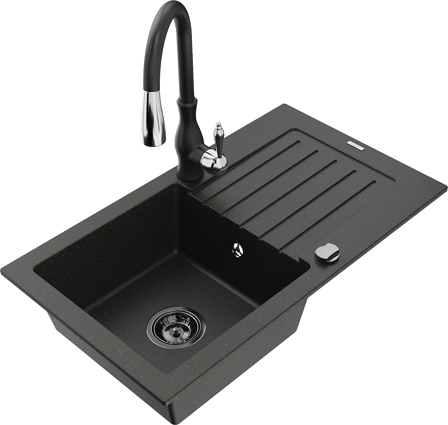 Mexen Pablo granitový kuchynský drez s odkvapkávačom a kuchynskou batériou Savita, čierny/zlatý metalik