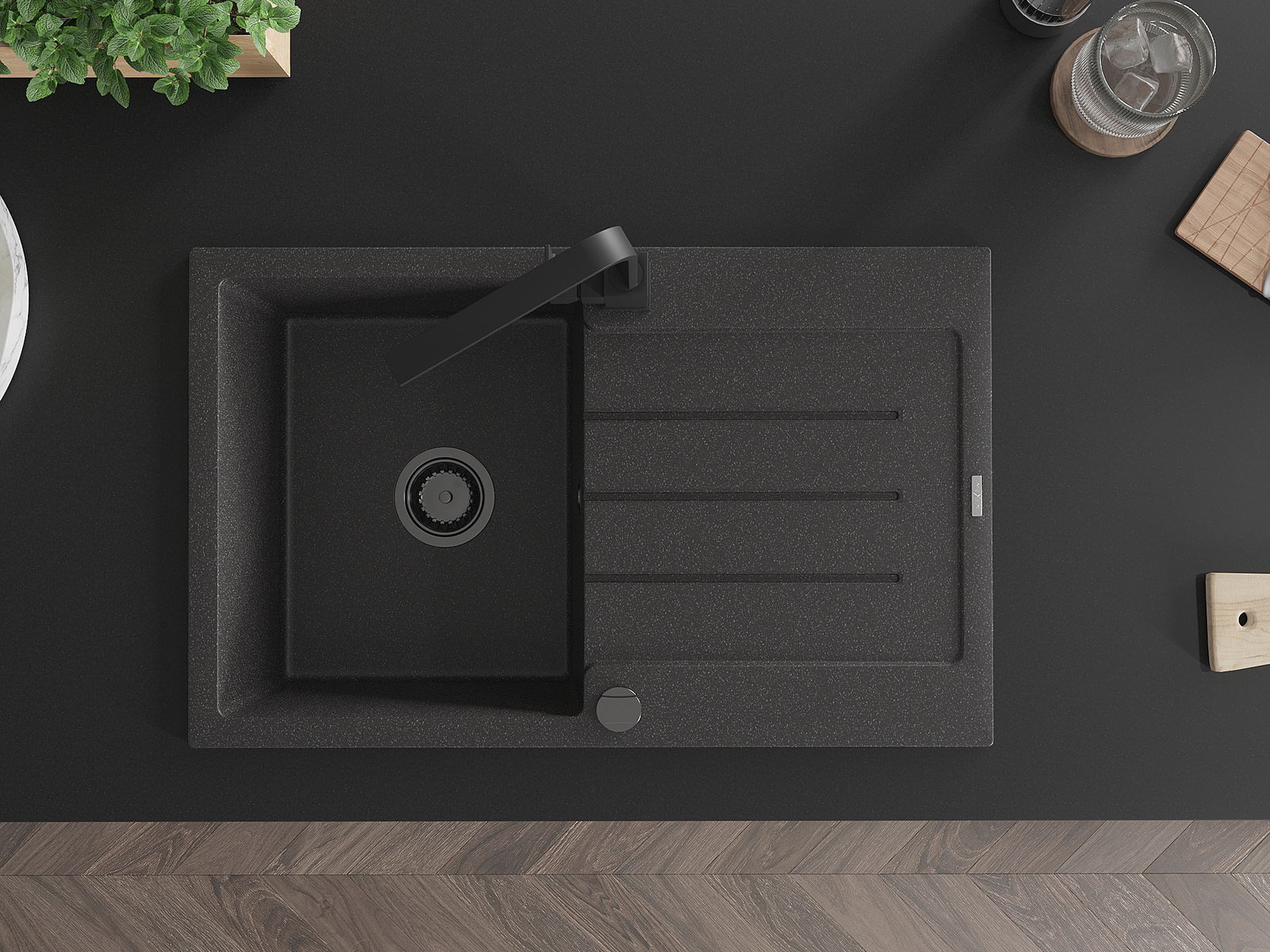 Povrch kuchynského drezu je odolný voči škvrnám a zafarbeniu, vďaka čomu sa ľahko udržiava a zachováva svoju farbu počas dlhého obdobia používania. Estetický a praktický doplnok pre každú kuchyňu.