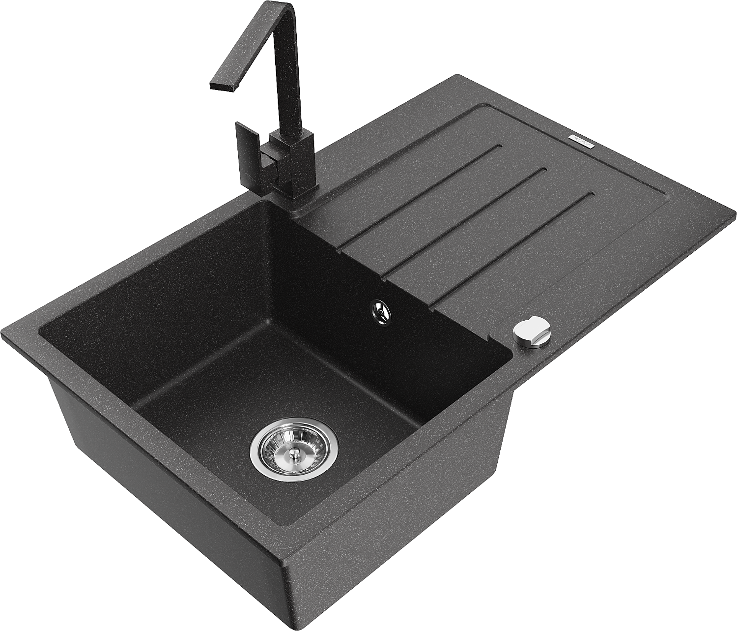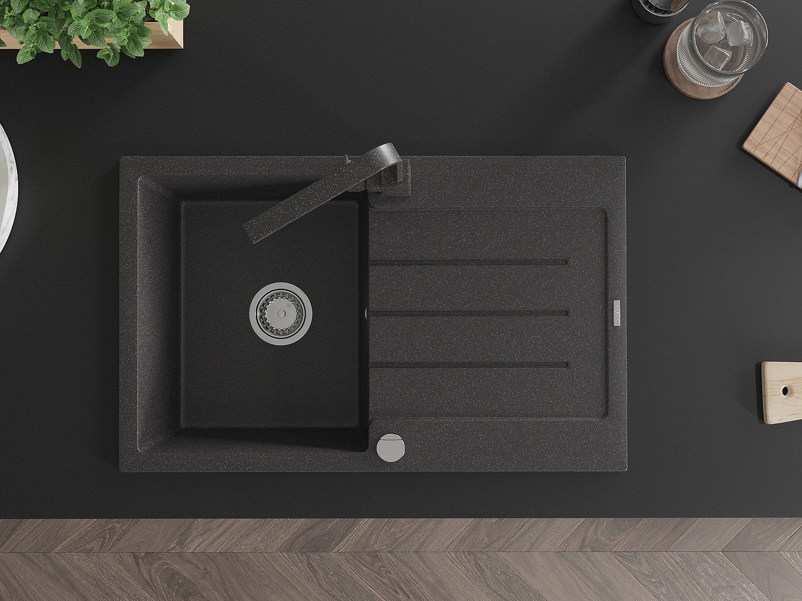 Mexen Bruno žulový drez jednokomorový s odkvapkávačom a kuchynskou batériou Rita, čierna bodkovaná - 6513-76-670300-76