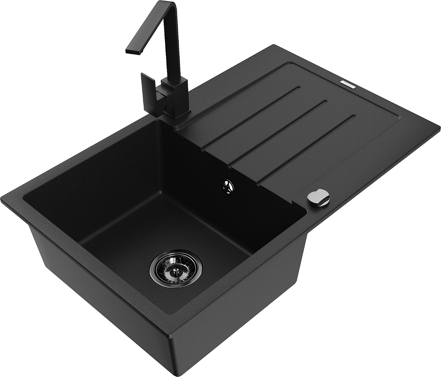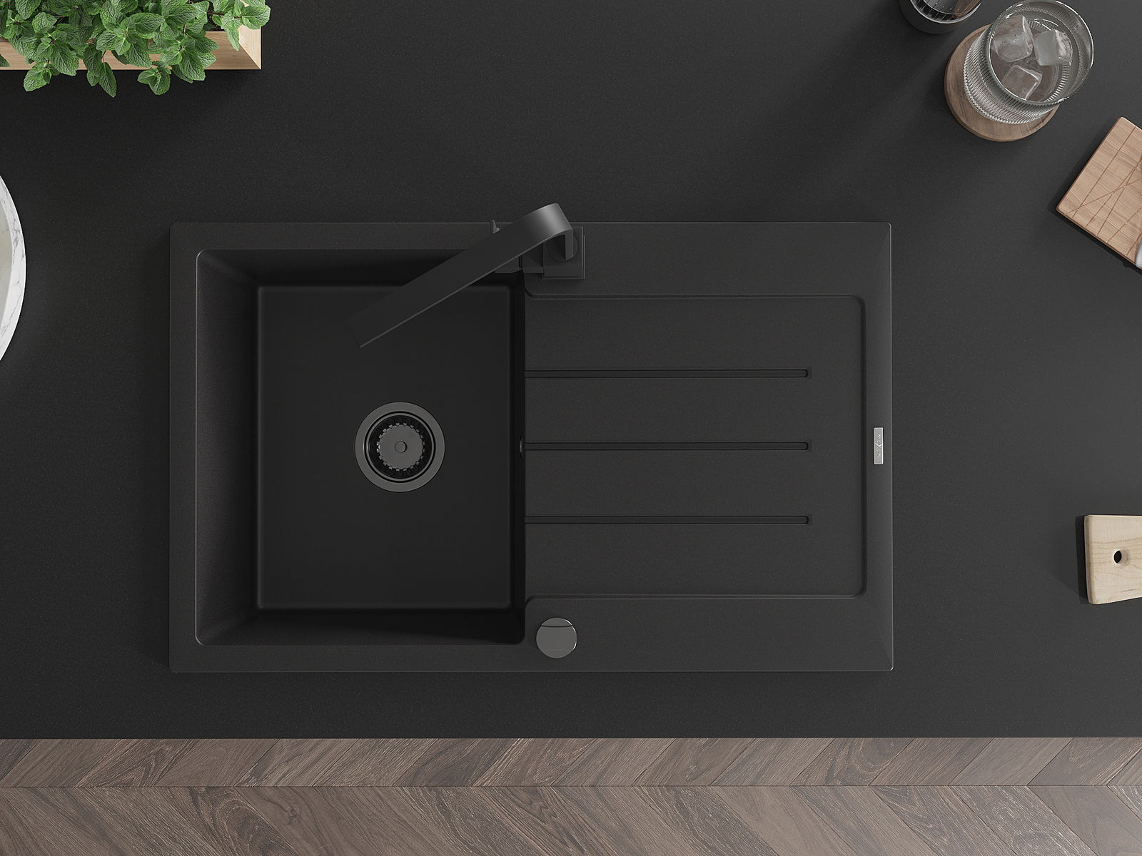 Mexen Bruno granitový drez s 1 komorou s odkvapkávačom a kuchynskou batériou Rita, čierny - 6513-77-670300-70-B