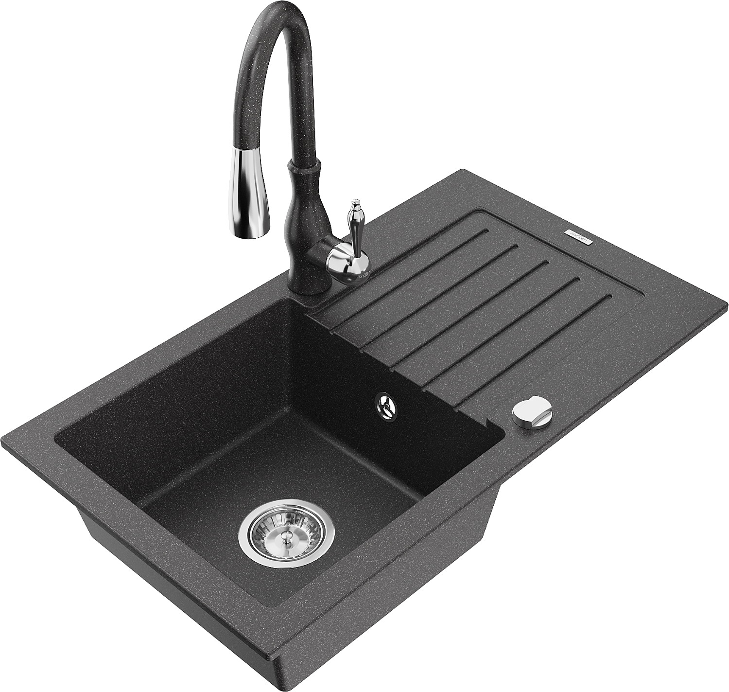 Mexen Pablo žulový kuchynský drez 1-komorový s odkvapkávačom a kuchynskou batériou Savita, čierny bodkovaný - 6510-76-672601-76