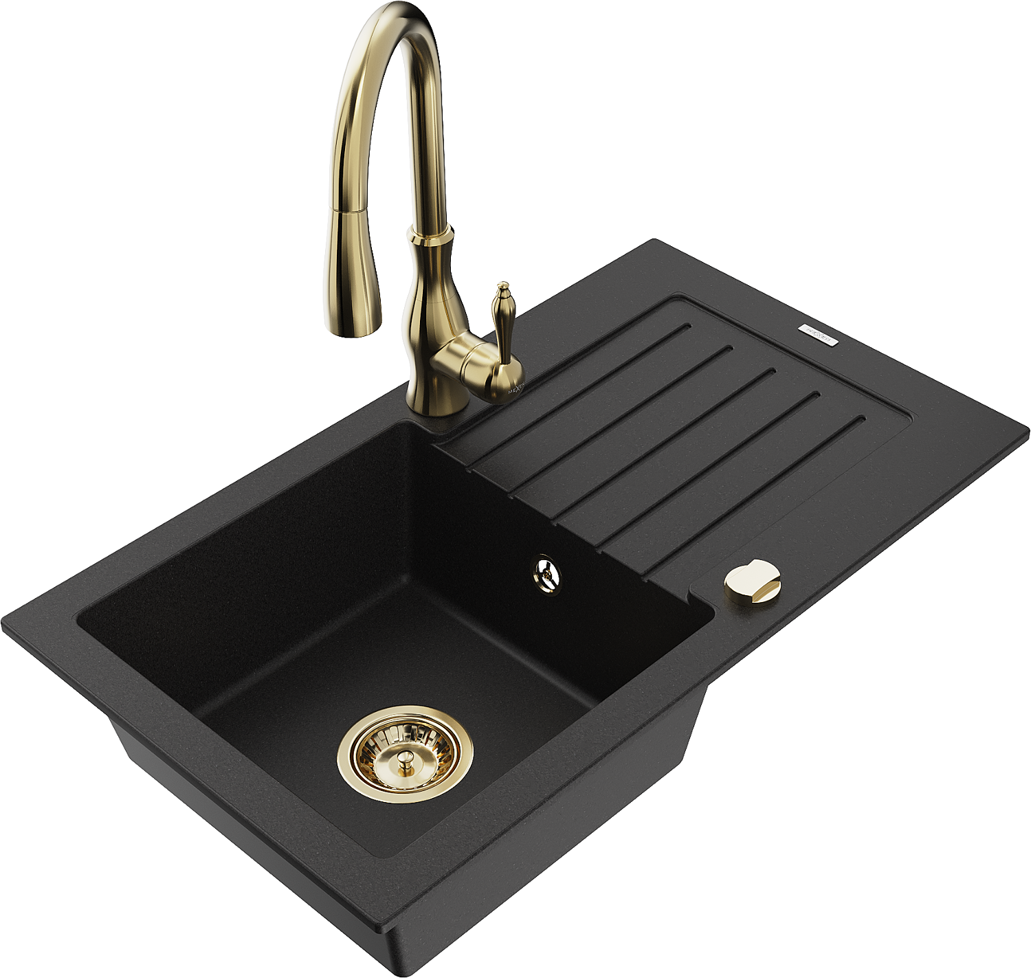 Mexen Pablo granitový drez s 1 komorou a odkvapkávačom a kuchynskou batériou Savita, čierny - 6510-77-672601-50