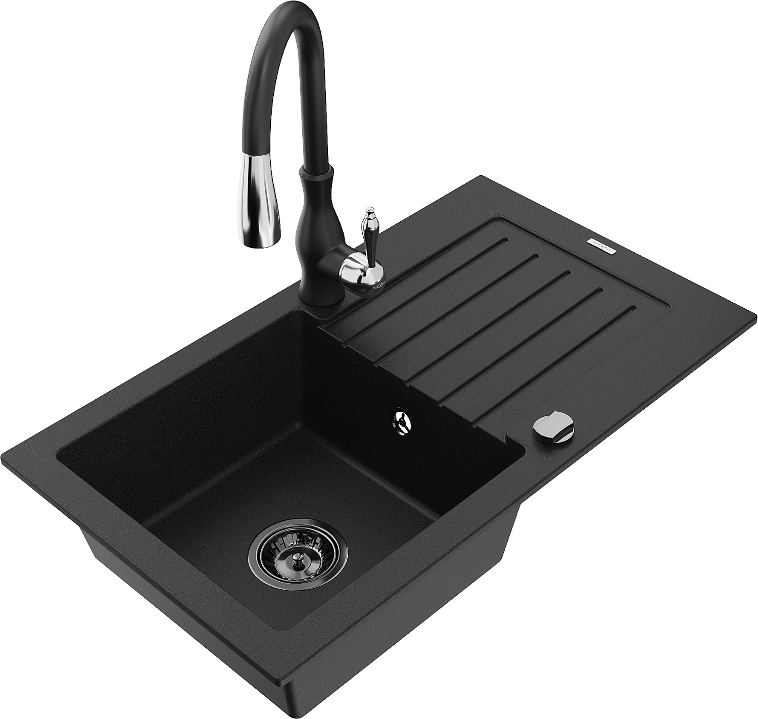 Mexen Pablo žulový kuchynský drez s 1 komorou, odkvapkávačom a kuchynskou batériou Savita, čierny - 6510-77-672601-70-B