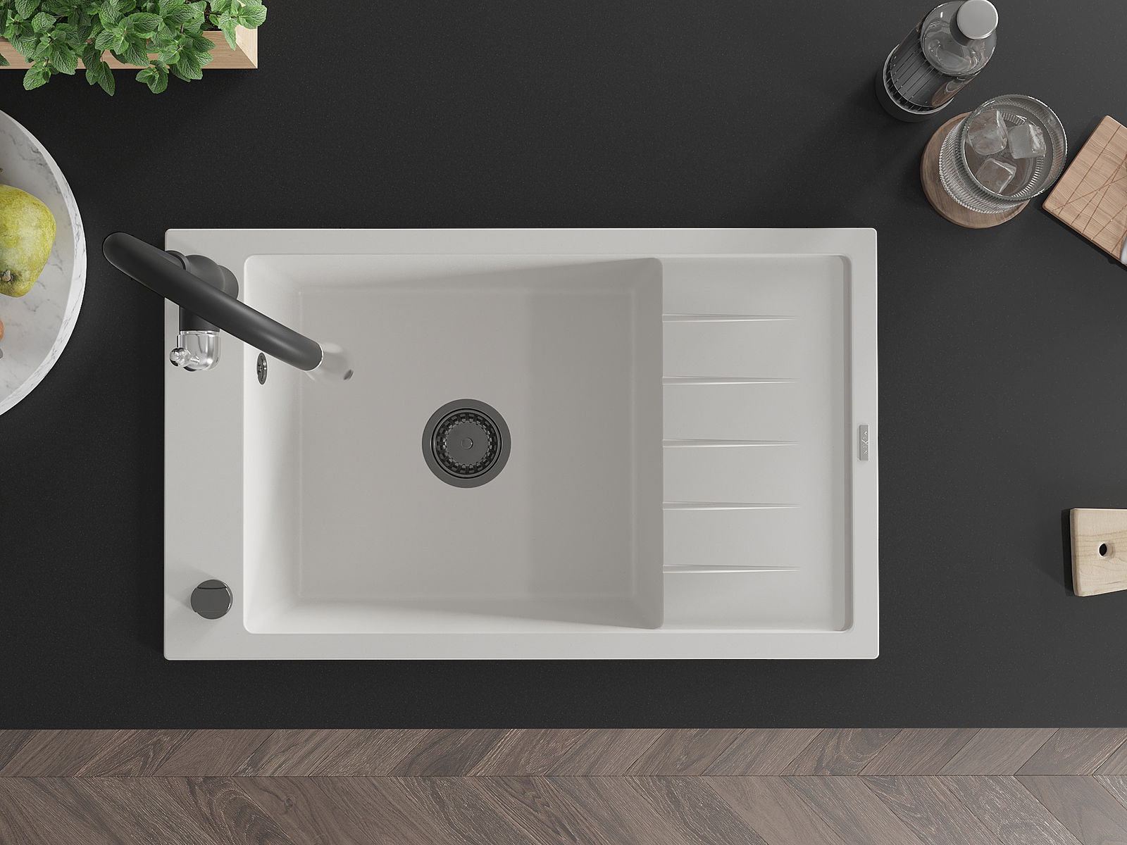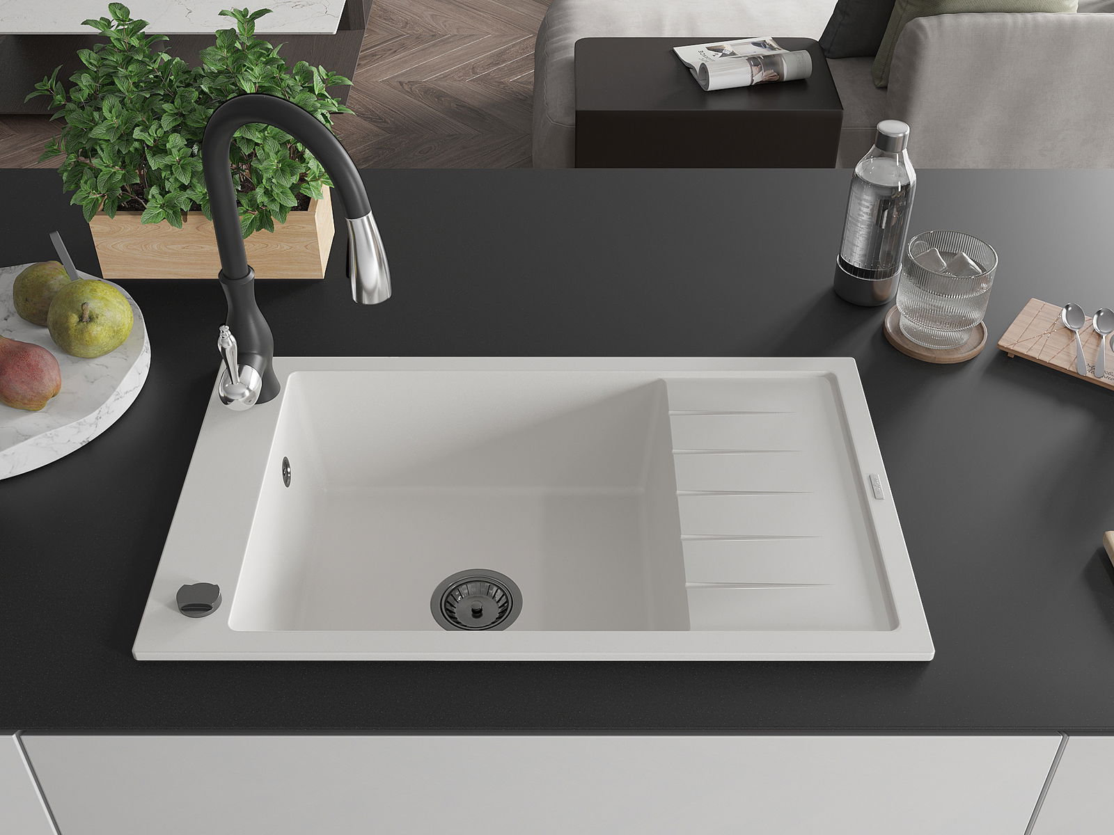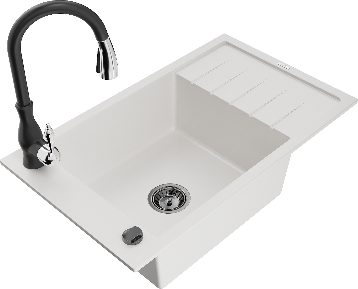 Mexen Elias granitový jednodrez s odkvapkávačom a kuchynskou batériou Savita, biely - 6511-20-672601-70
