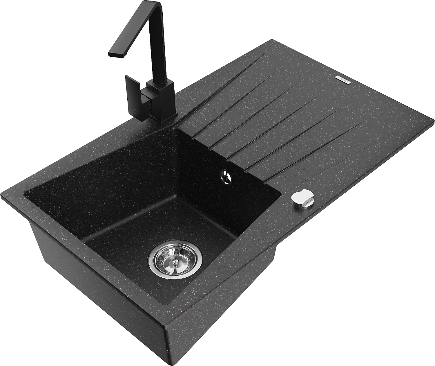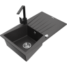 Mexen Cesar granitový kuchynský drez s jednou komorou s odkvapkávačom a kuchynskou batériou Rita, čierna/strieborný