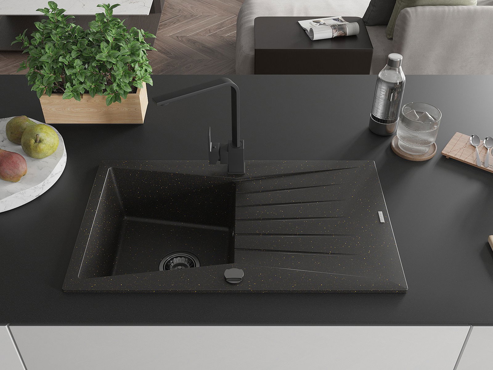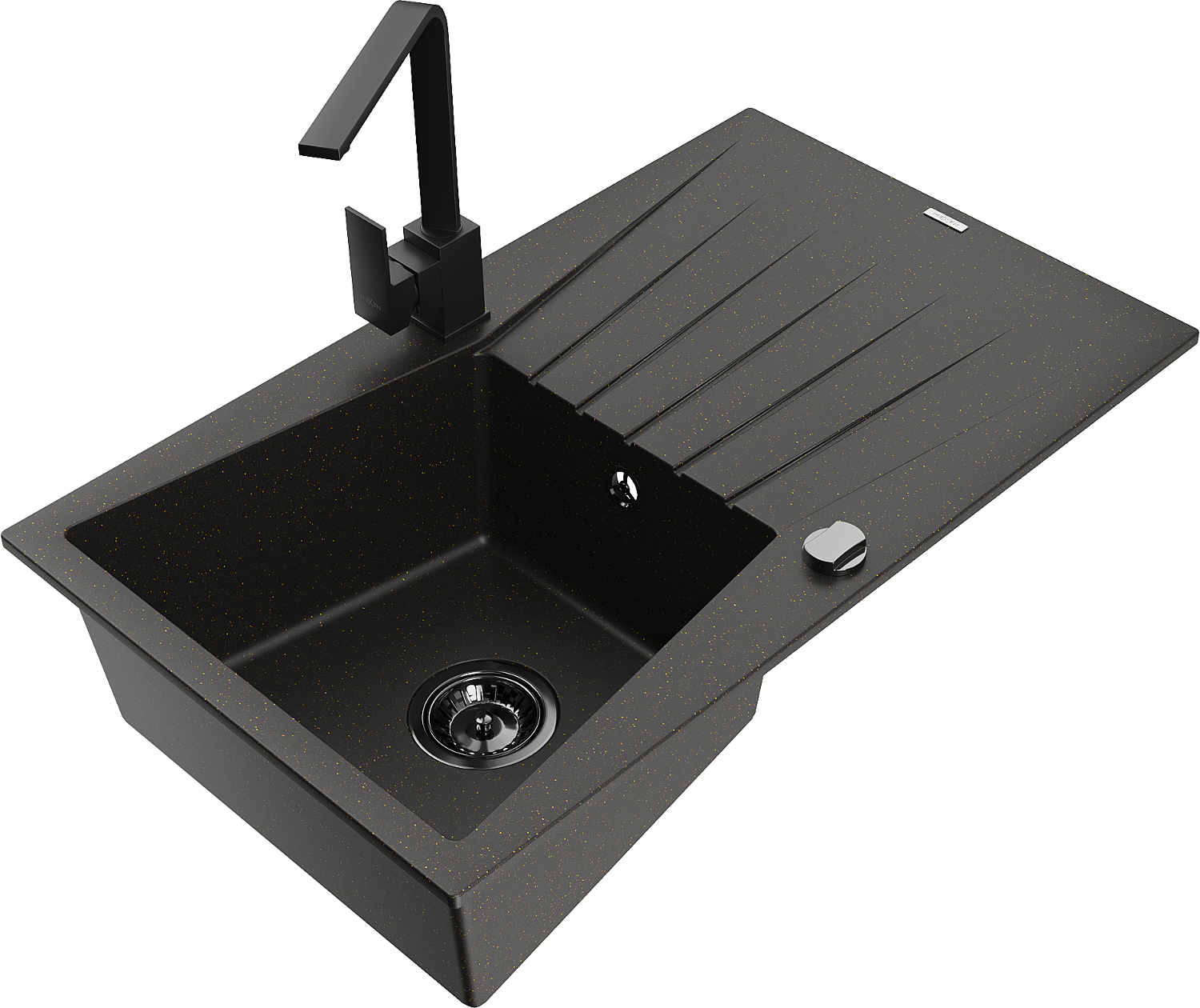 Mexen Cesar granitový jednokomorový drez s odkvapkávačom a kuchynskou batériou Rita, čierny/zlatý metalik