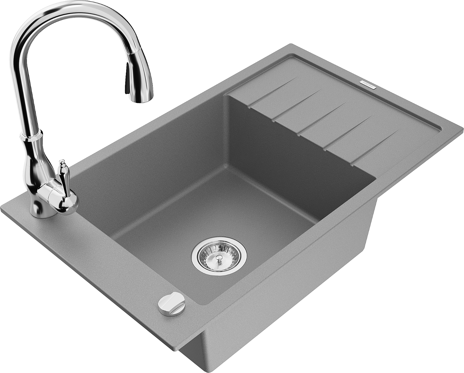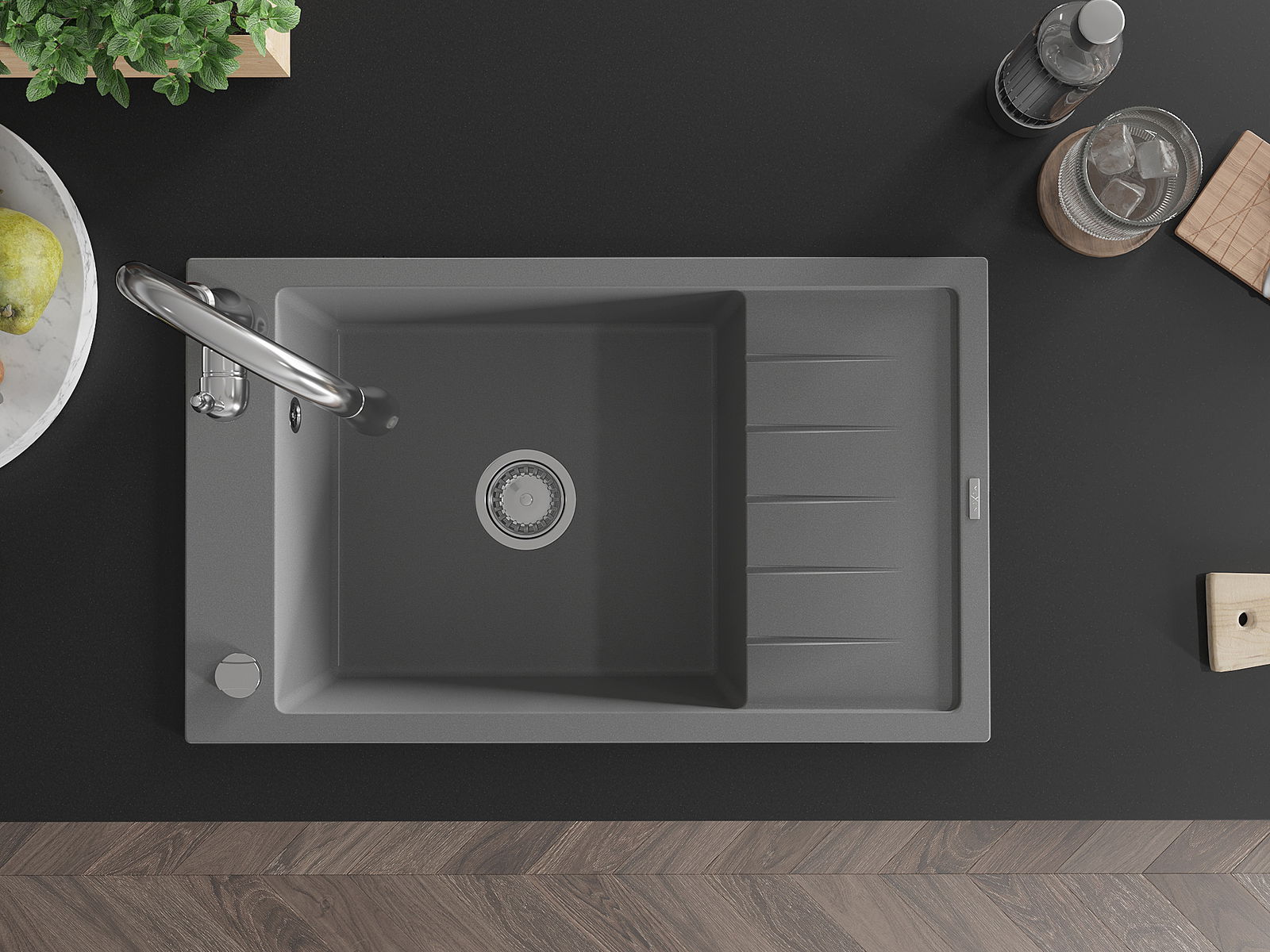 Mexen Elias žulový drez s 1-komorou s odkvapkávačom a kuchynskou batériou Savita, sivý - 6511-71-672601-00