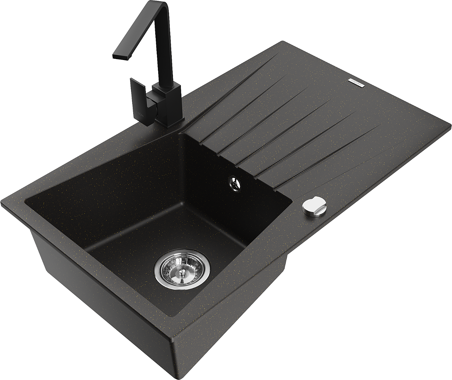 Mexen Cesar žulový kuchynský drez s jednou komorou, odkvapkávačom a kuchynskou batériou Rita, čierny/zlatý metalický