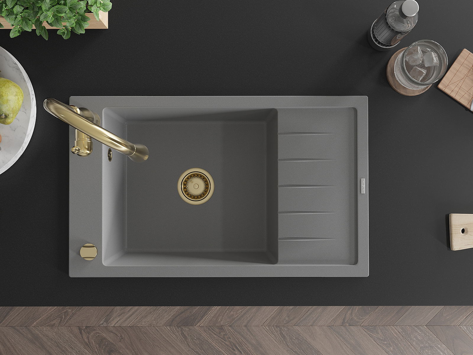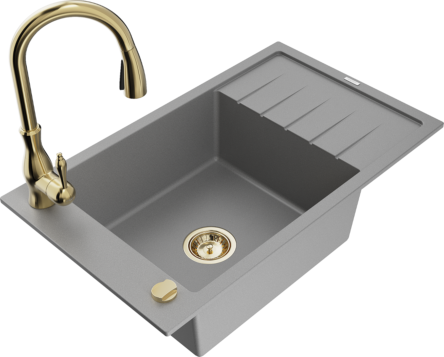 Mexen Elias granitový drez 1-komorový s odkvapkávačom a kuchynskou batériou Savita, sivý - 6511-71-672601-50