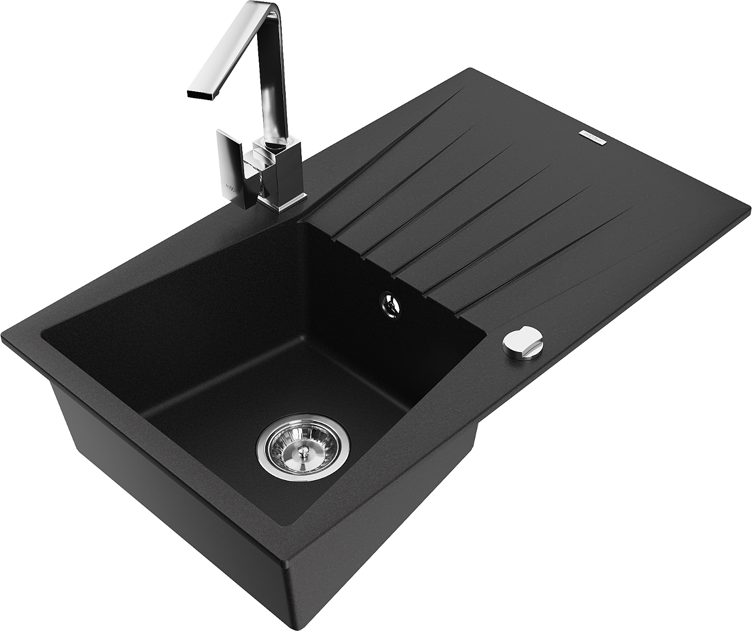 Mexen Cesar granitový drez 1-komorový s odkvapkávačom a kuchynskou batériou Rita, čierny - 6514-77-670300-00