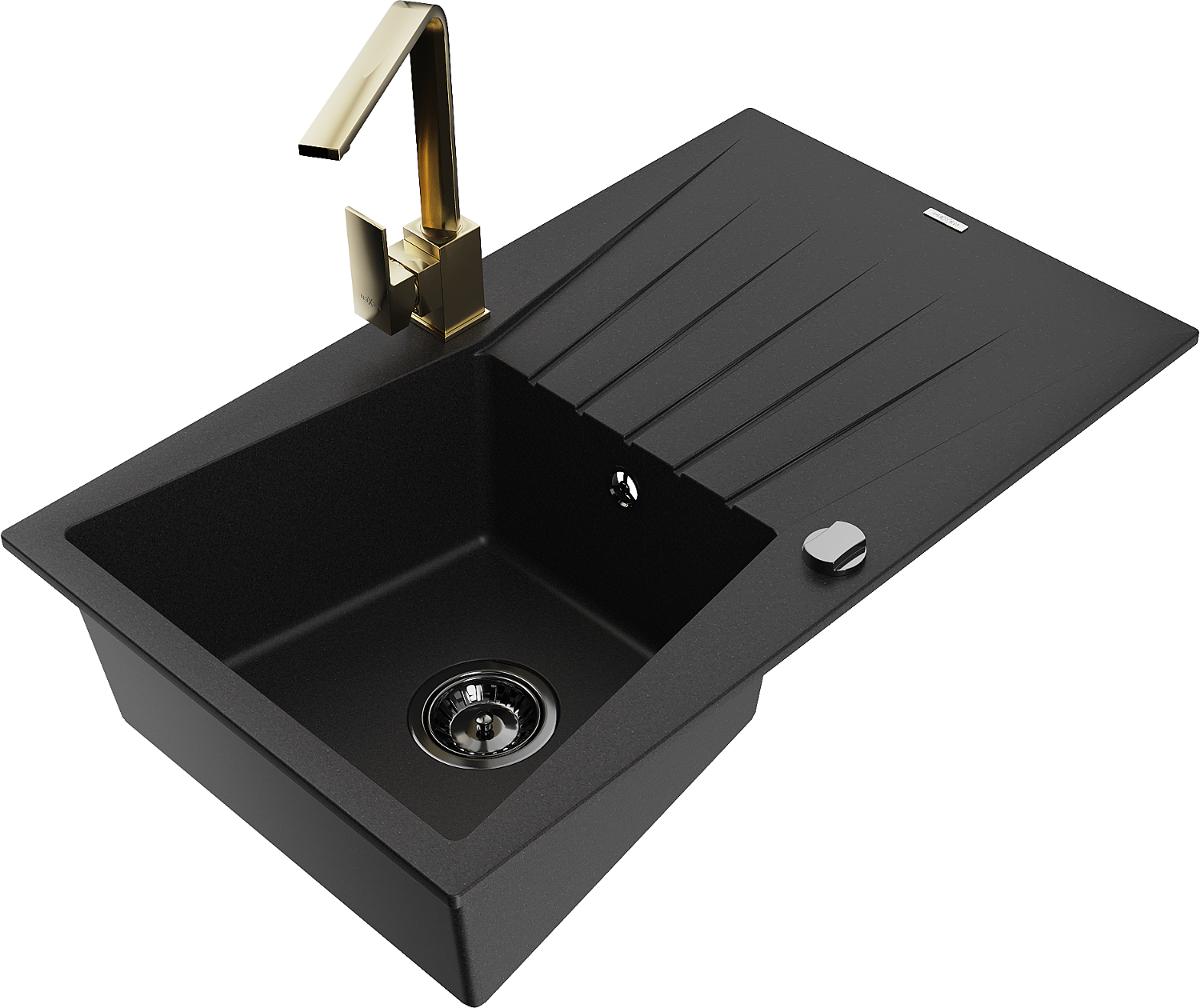 Mexen Cesar 1-komorový granitový drez s odkvapkávačom a kuchynskou batériou Rita, čierny - 6514-77-670300-50-B
