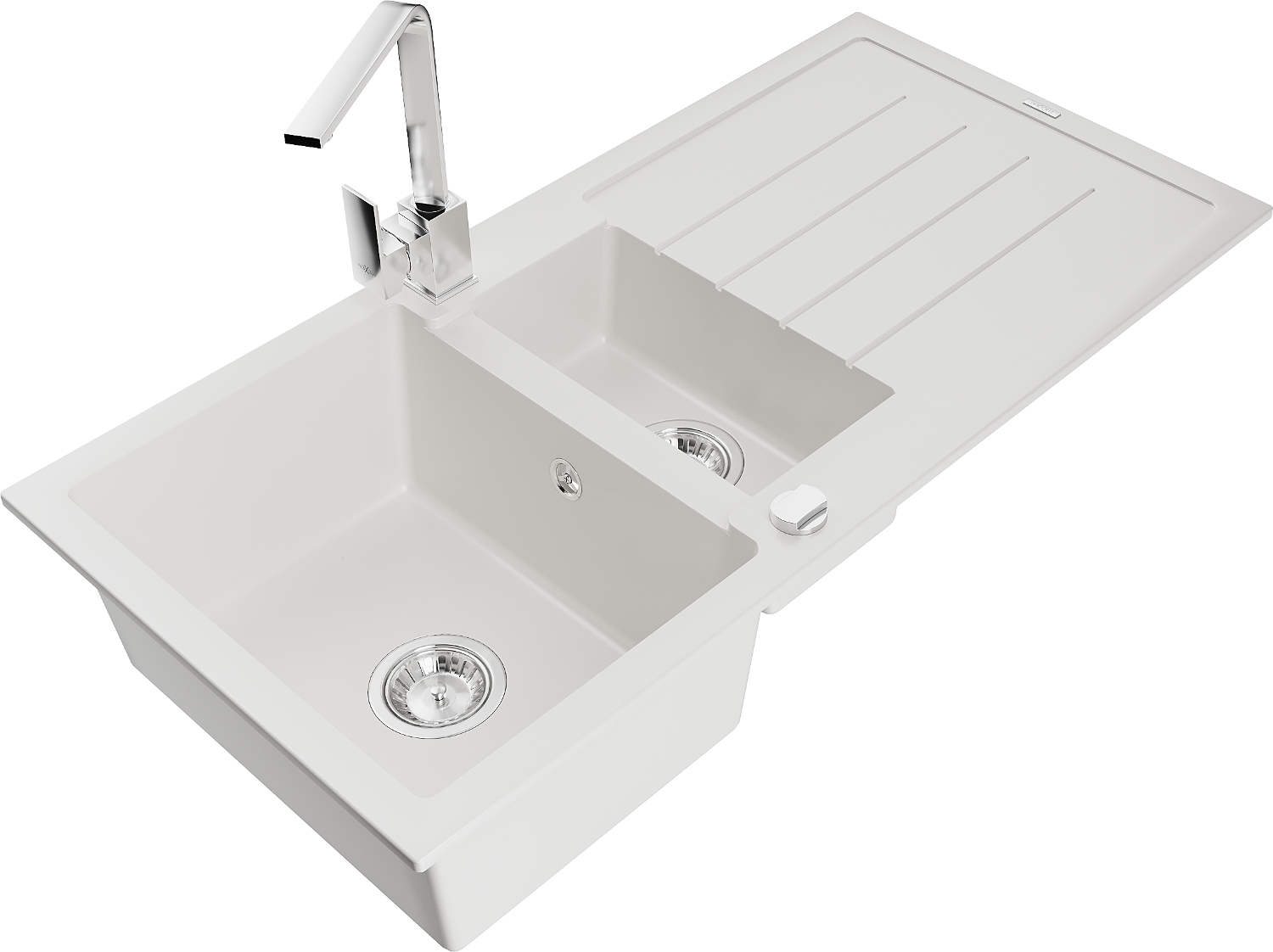 Mexen Andres žulový kuchynský drez 1,5-komorový s odkvapkávačom a kuchynskou batériou Rita, biela - 6515-20-670300-00