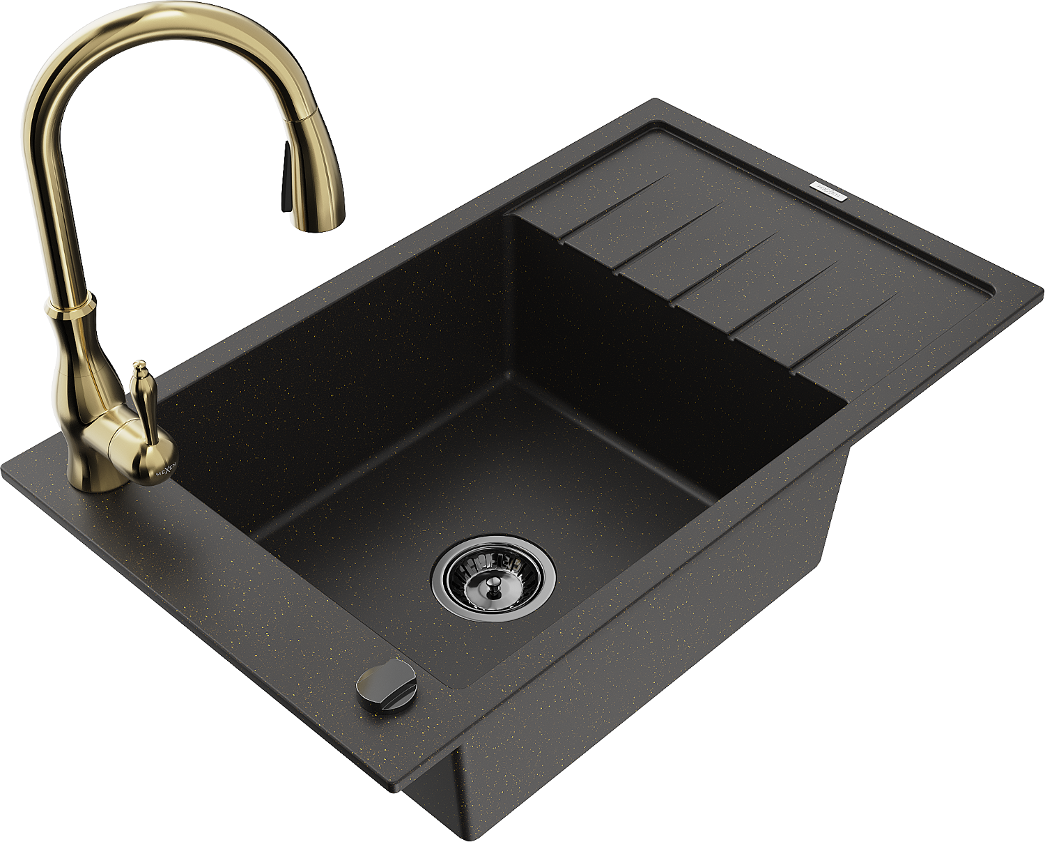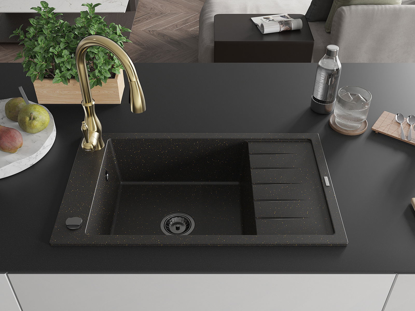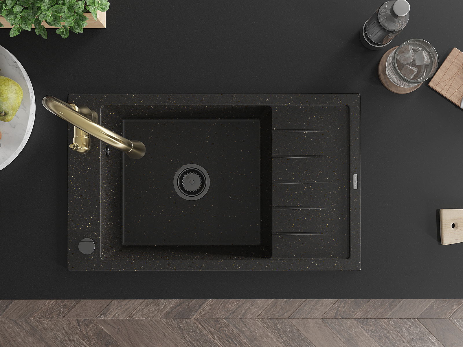 Mexen Elias granitový drez s 1 komorou s odkvapkávačom a kuchynskou batériou Savita, čierny/zlatý metalik - 6511-75-672601-50-B