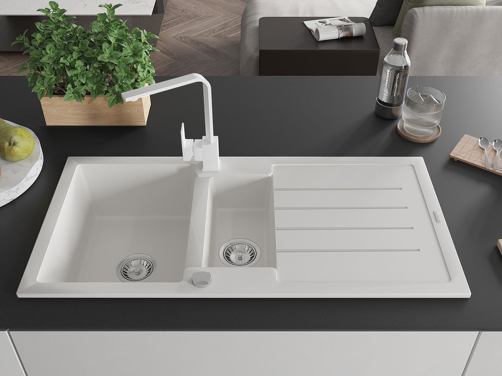 Povrch umývadla je odolný voči škvrnám a sfarbeniu, vďaka čomu sa ľahko čistí a zachováva si svoju farbu po dlhú dobu. Estetický a prakticky dopĺňajúci každú kuchyňu.