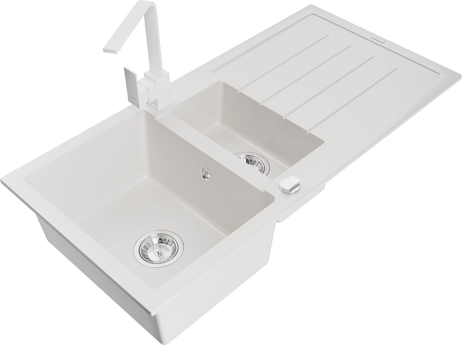 Mexen Andres žulový drez 1,5-komorový s odkvapkávačom a kuchynskou batériou Rita, biely - 6515-20-670300-20