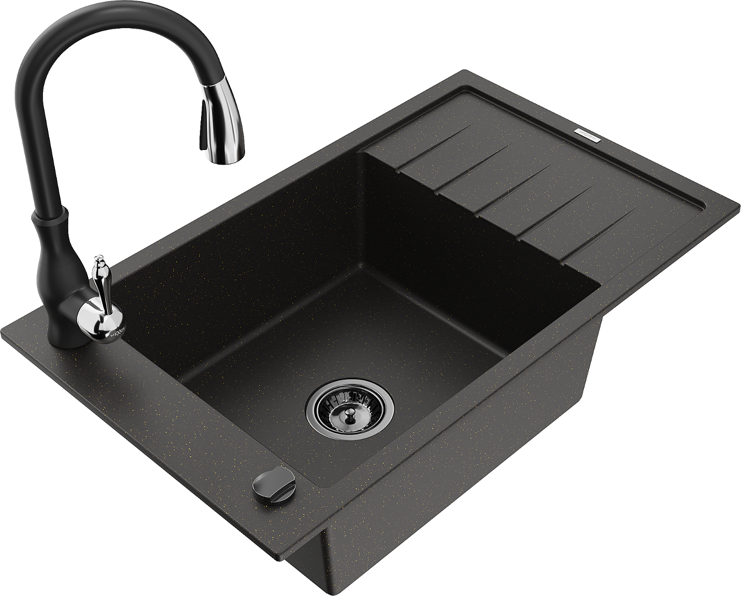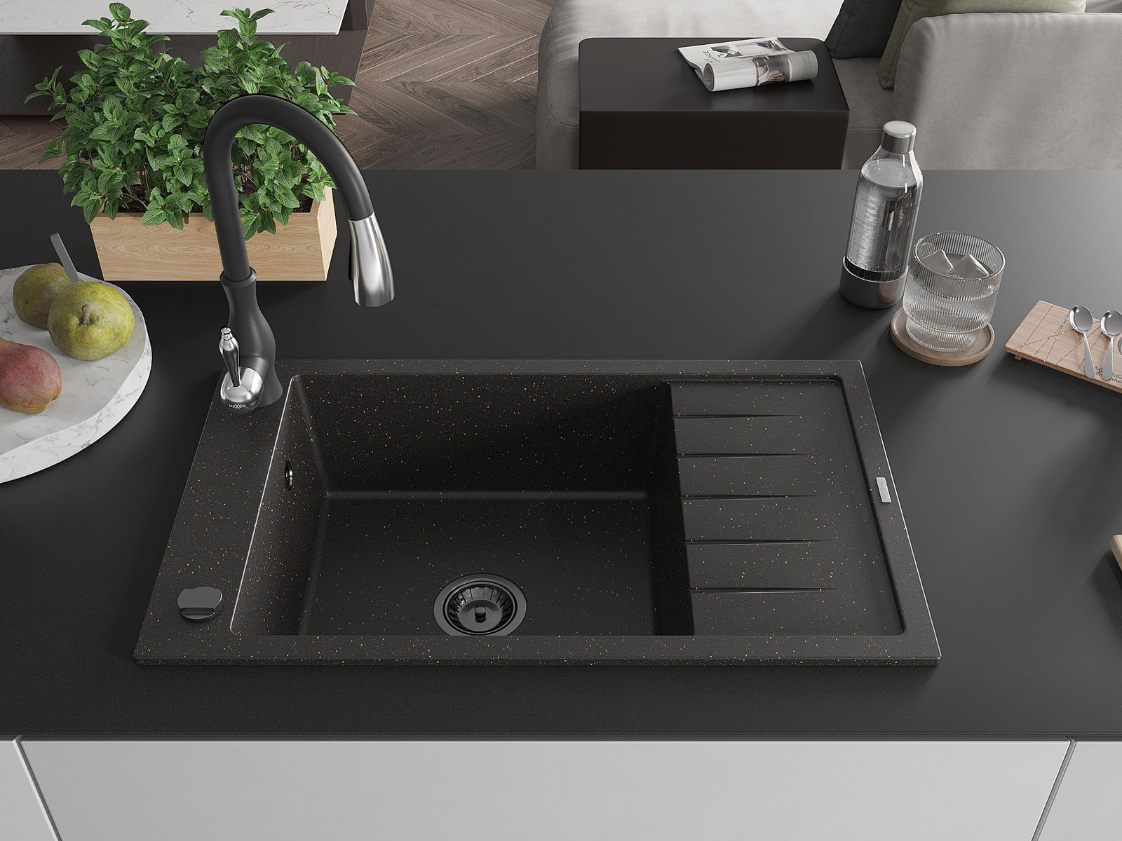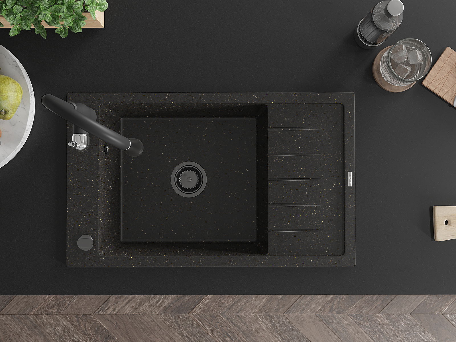 Mexen Elias granitový drez 1-komorový s odkvapkávačom a kuchynskou batériou Savita, čierny/zlatý metalík - 6511-75-672601-70-B