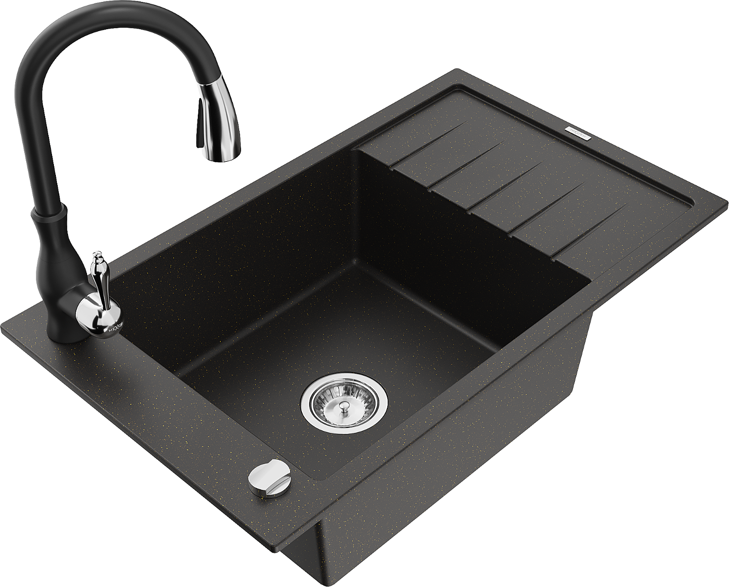 Mexen Elias Granitový drez s 1 komorou, s odkvapkávačom a kuchynskou batériou Savita, čierna/zlatá metalíza