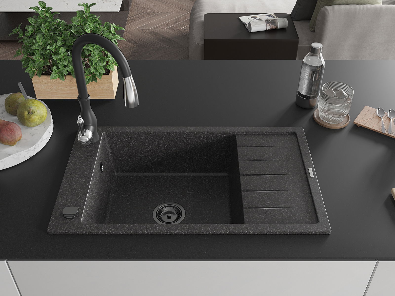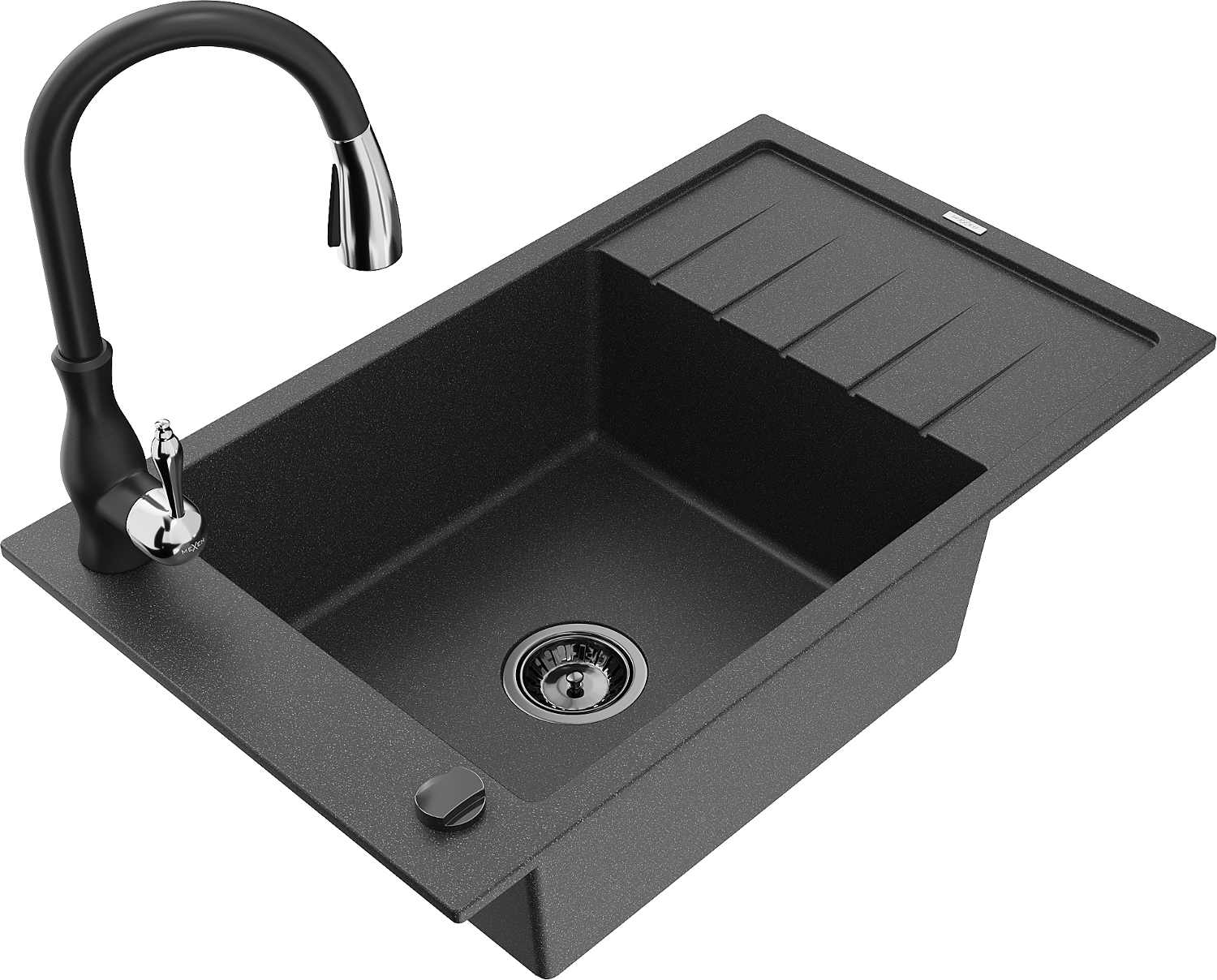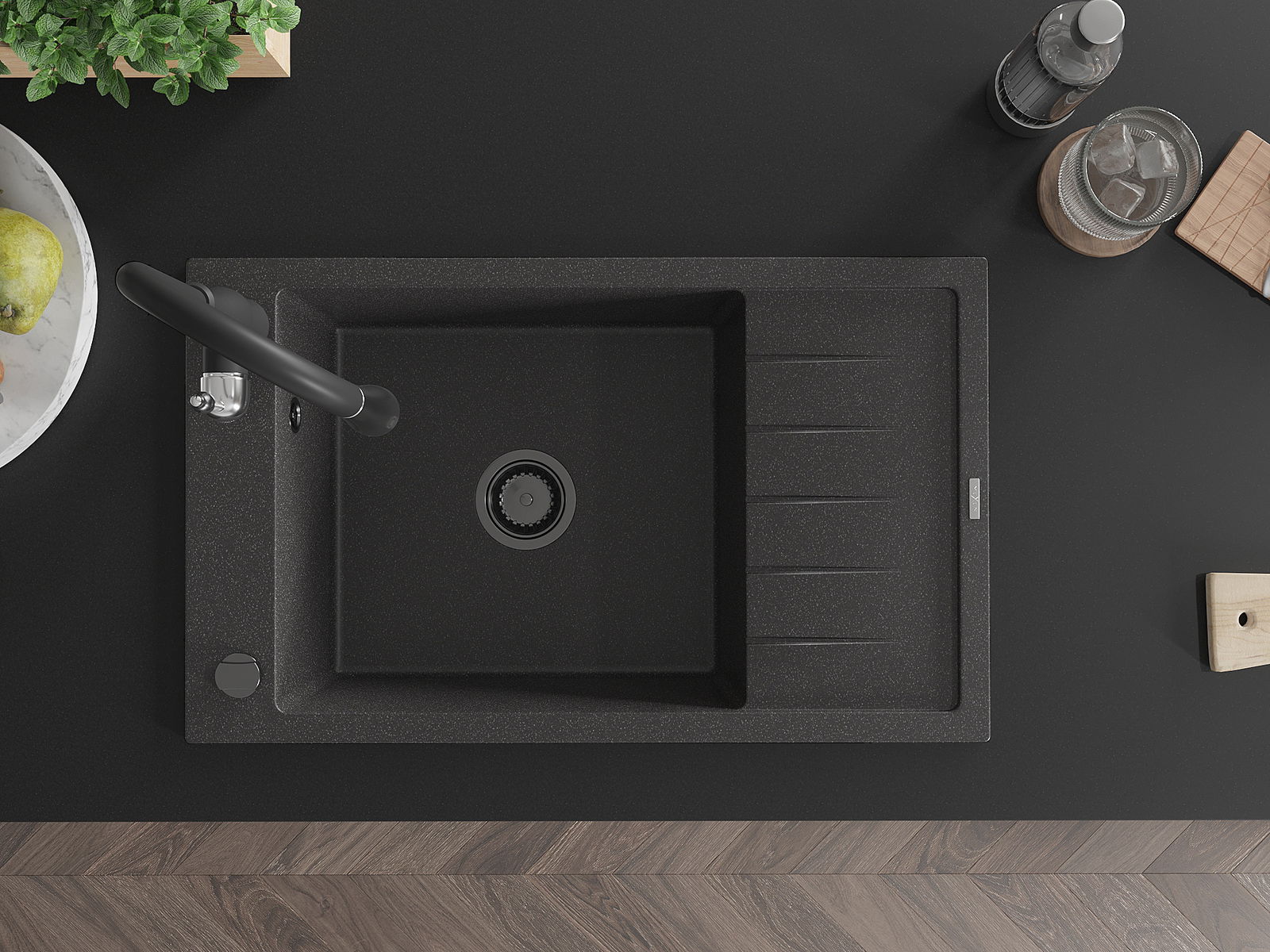 Mexen Elias granitový drez 1-komorový s odkvapkávačom a kuchynskou batériou Savita, čierno škvrnitý