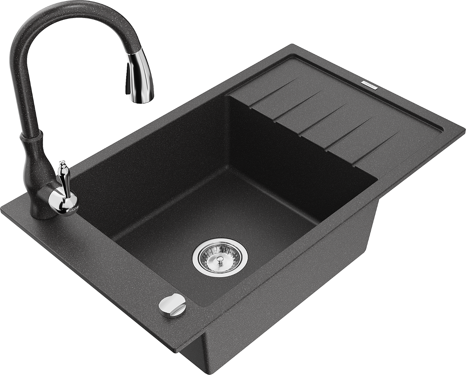 Mexen Elias jednokomorový granitový drez s odkvapkávačom a kuchynskou batériou Savita, čierny s bodkami - 6511-76-672601-76
