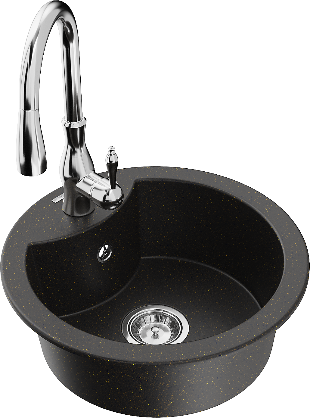Mexen Diego granitový drez 1-komorový s kuchynskou batériou Savita, čierny/zlatý metalik - 6512-75-672601-00