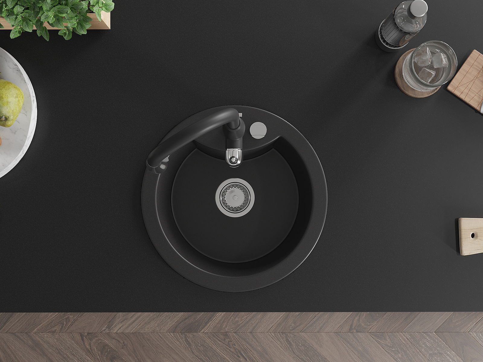 Mexen Diego žulový kuchynský drez 1-komorový s kuchynskou batériou Savita, čierny - 6512-77-672601-70
