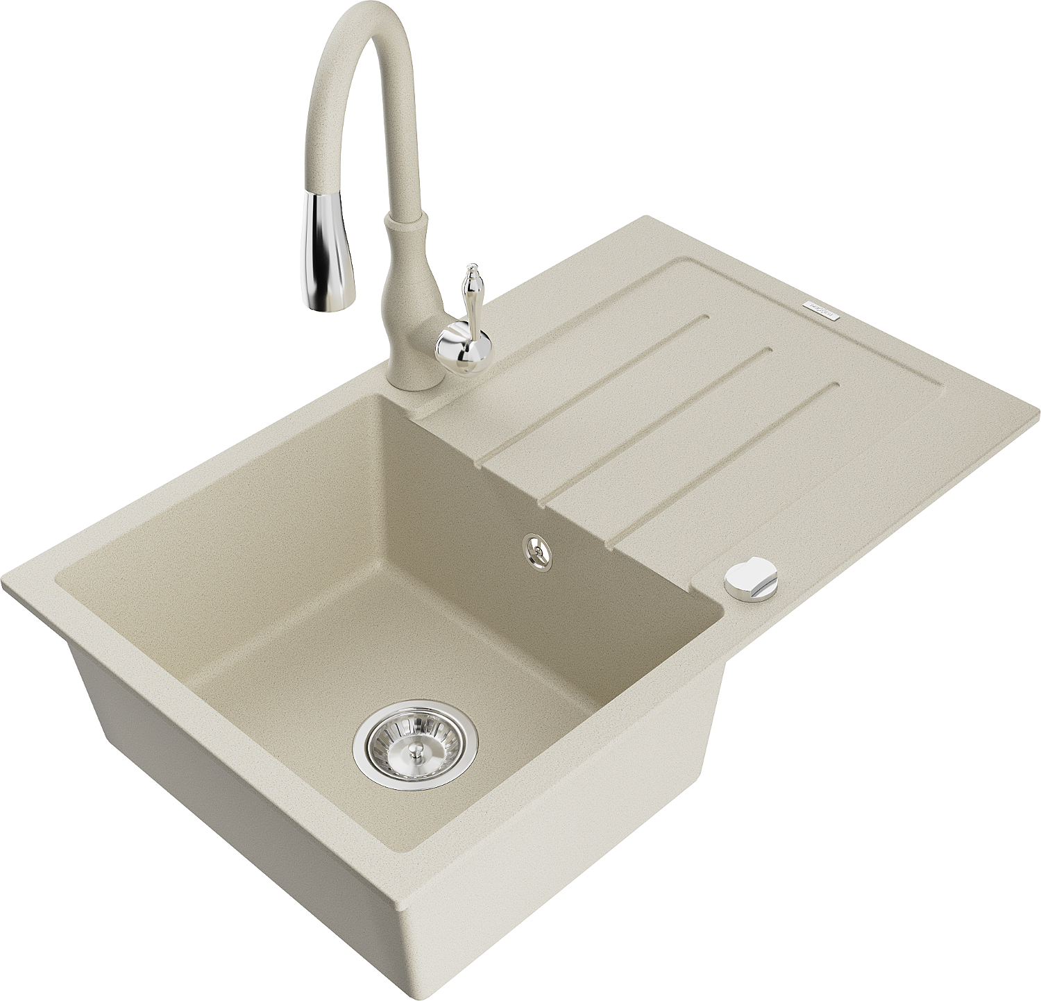 Mexen Bruno žulový kuchynský drez 1-komorový s odkvapkávačom a kuchynskou batériou Savita, béžový - 6513-69-672601-69
