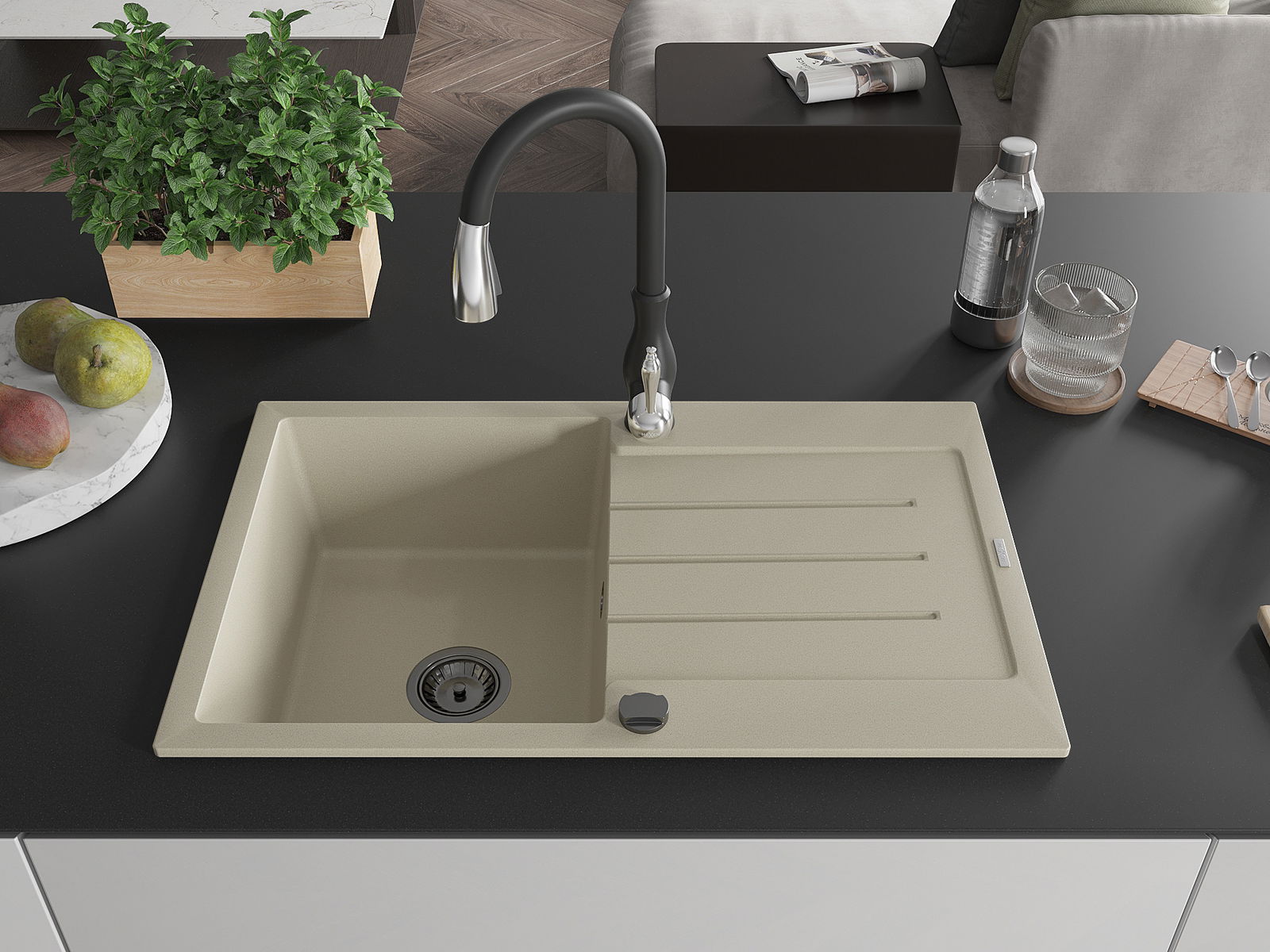 Povrch umývadla je odolný voči škvrnám a sfarbeniu, vďaka čomu sa ľahko čistí a zachováva si svoju farbu po dlhú dobu. Estetický a prakticky dopĺňajúci každú kuchyňu.