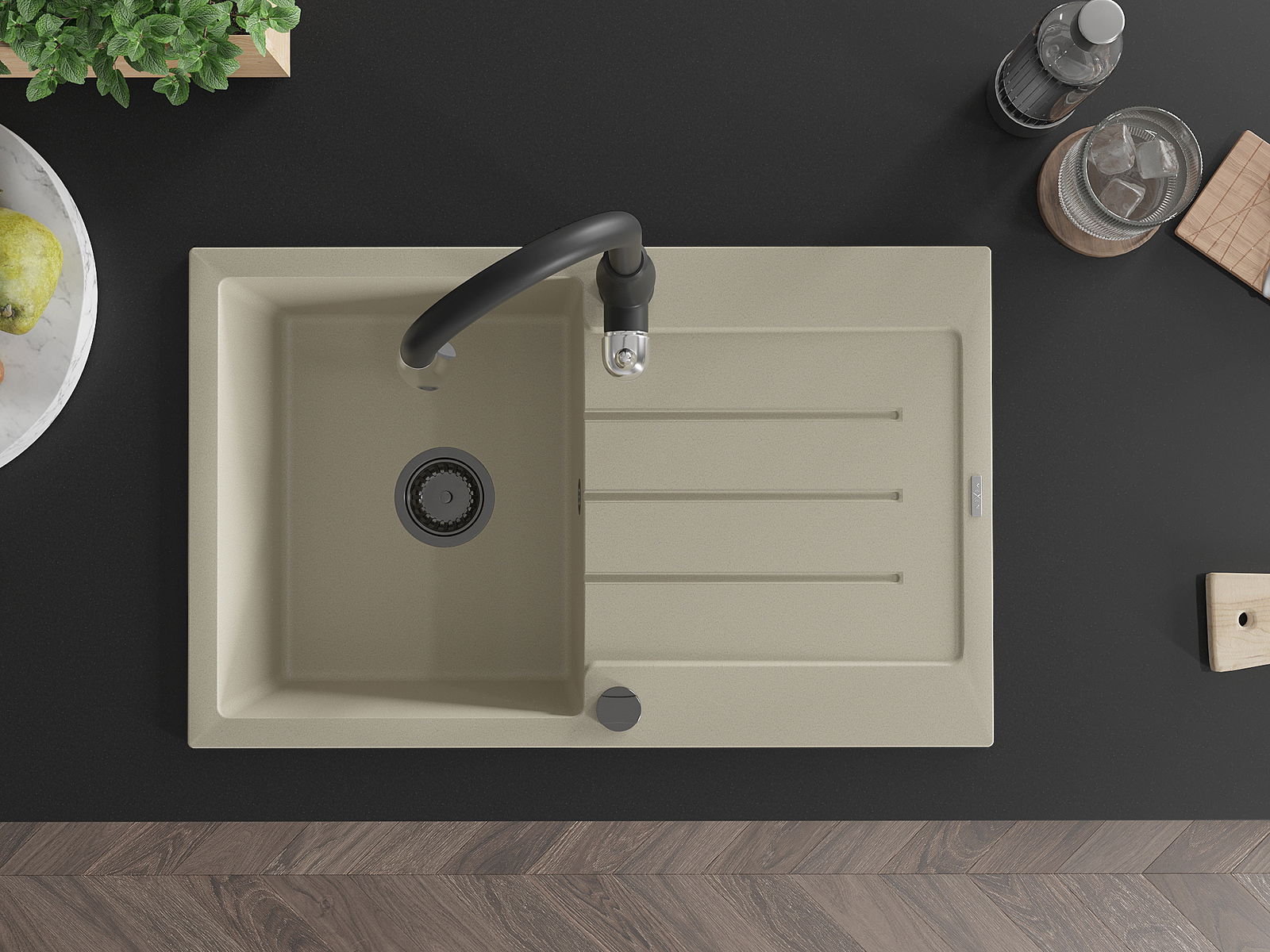 Mexen Bruno žulový drez s 1 komorou s odkvapkávačom a kuchynskou batériou Savita, béžový - 6513-69-672601-70