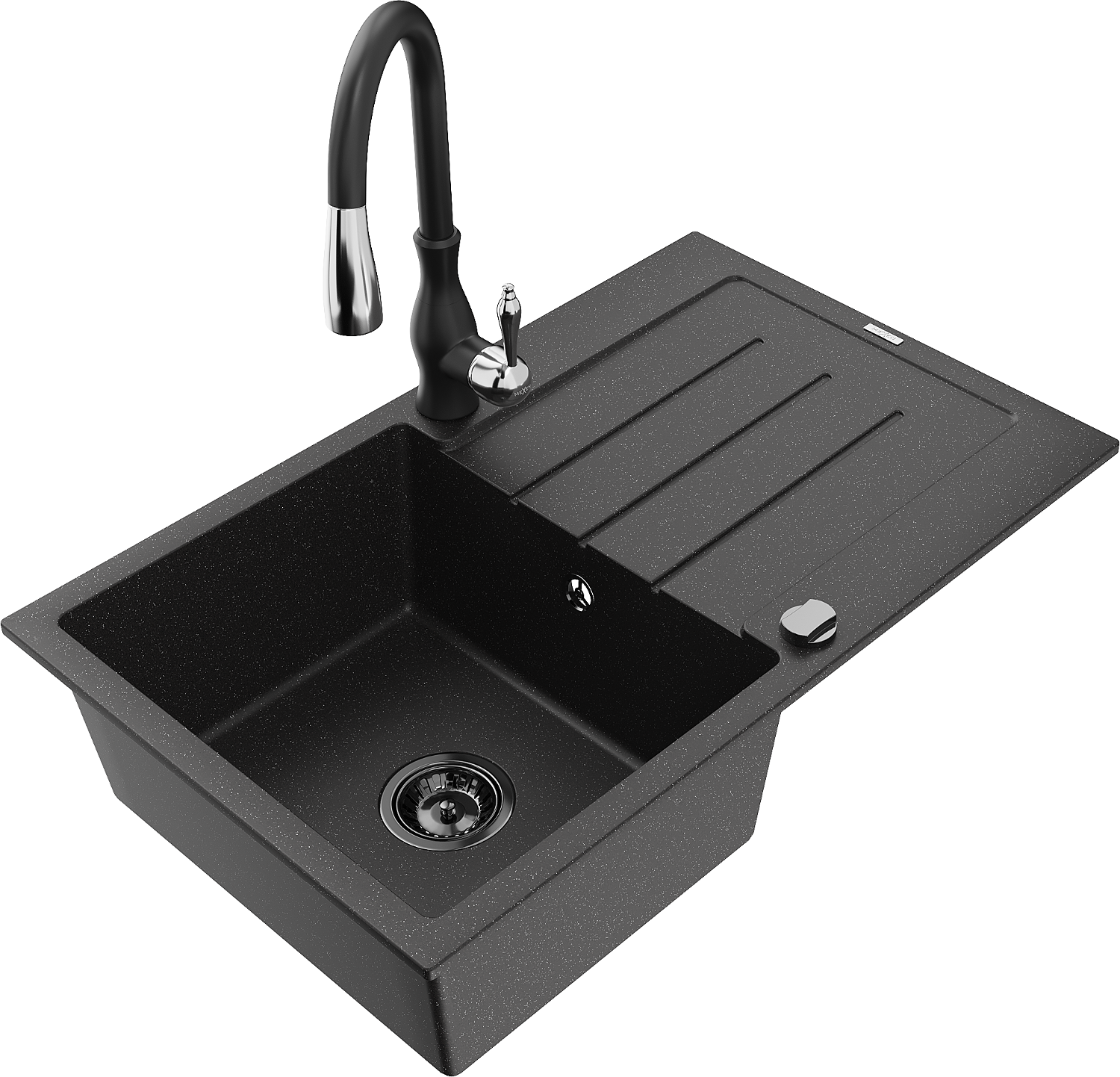 Mexen Bruno žulový drez 1-komorový s odkvapkávačom a kuchynskou batériou Savita, čierny/strieborný - 6513-73-672601-70-B