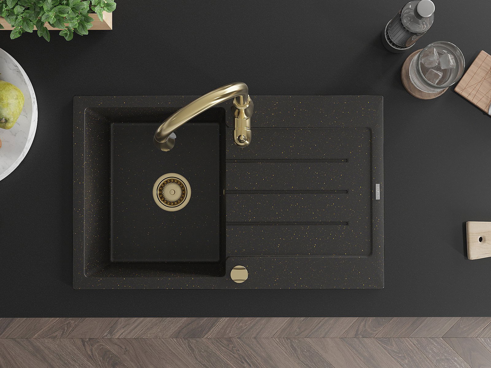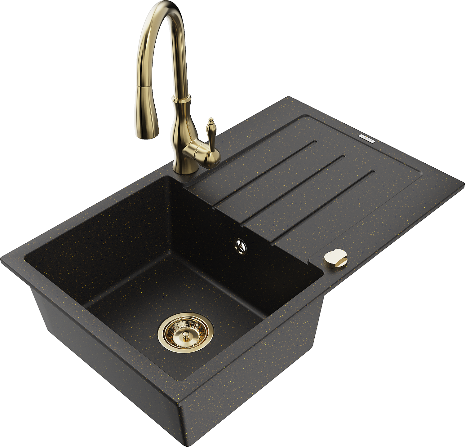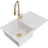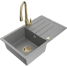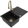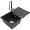 Mexen Bruno granitový drez s 1 komorou, odkvapkávačom a kuchynskou batériou Savita, čiern/zlatý metalik