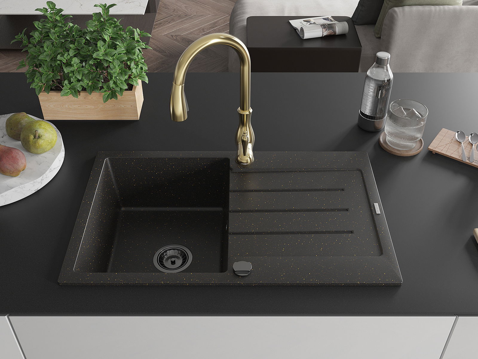 Mexen Bruno granitový drez 1-komorový s odkvapkávačom a kuchynskou batériou Savita, čierny/zlatý metalik - 6513-75-672601-50-B