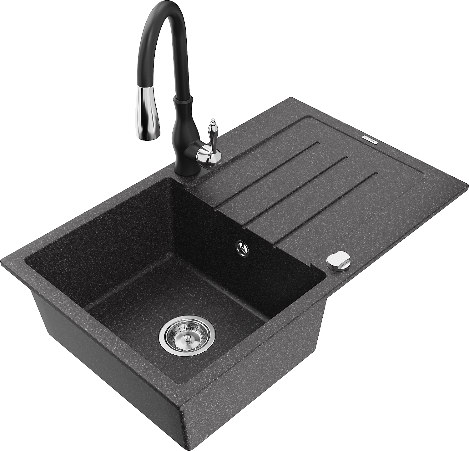 Mexen Bruno žulový drez 1-komorový s odkvapkávacou plochou a kuchynskou batériou Savita, čierny škvrnitý - 6513-76-672601-70