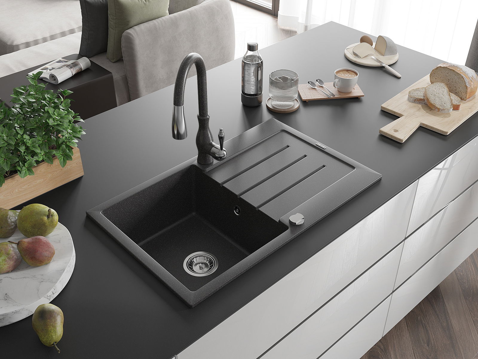 Povrch umývadla je odolný voči škvrnám a sfarbeniu, vďaka čomu sa ľahko čistí a zachováva si svoju farbu po dlhú dobu. Estetický a prakticky dopĺňajúci každú kuchyňu.