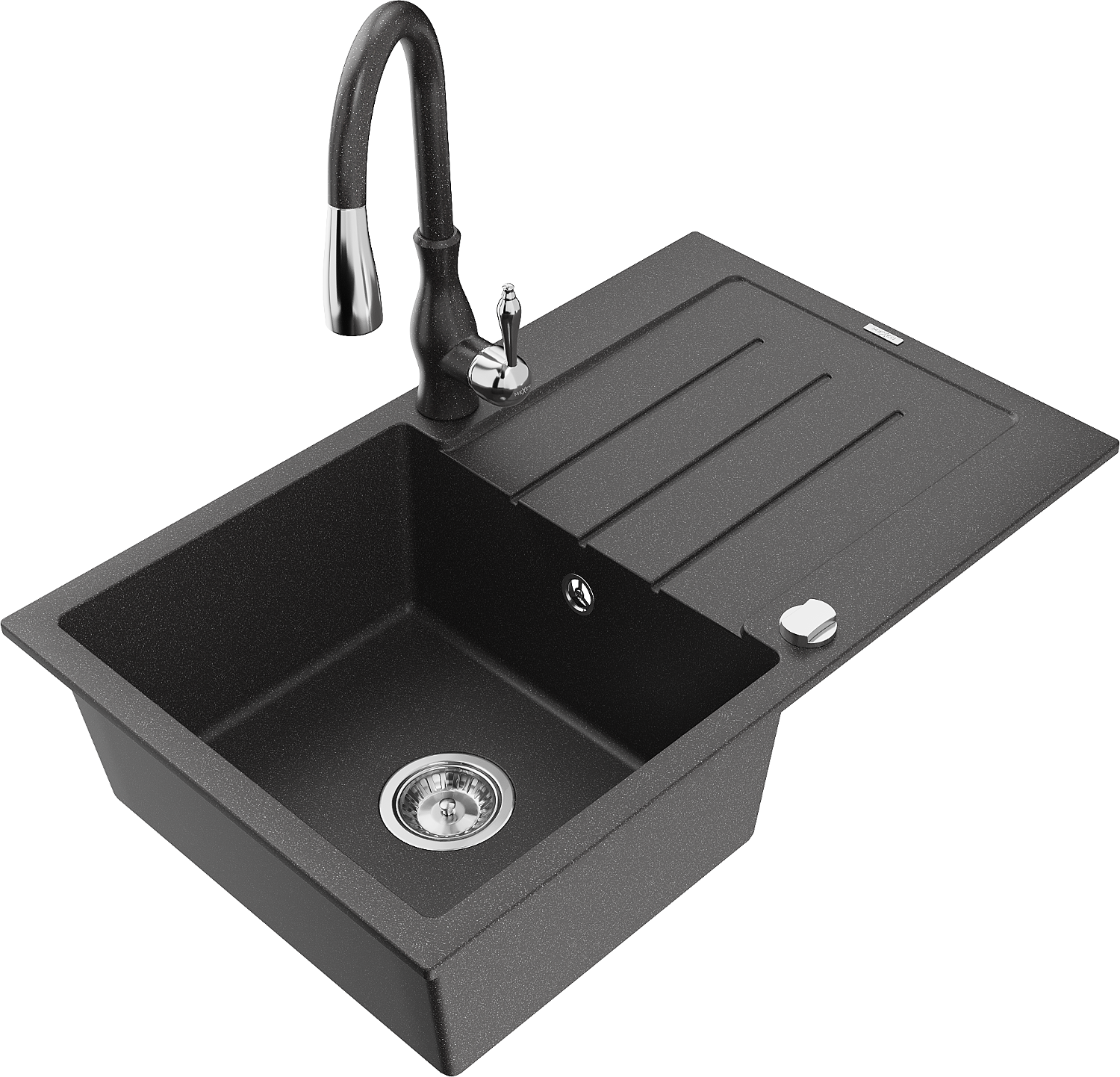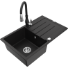 Mexen Bruno žulový drez 1-komorový s odkvapkávačom a kuchynskou batériou Savita, čierny s bielymi bodkami - 6513-76-672601-76