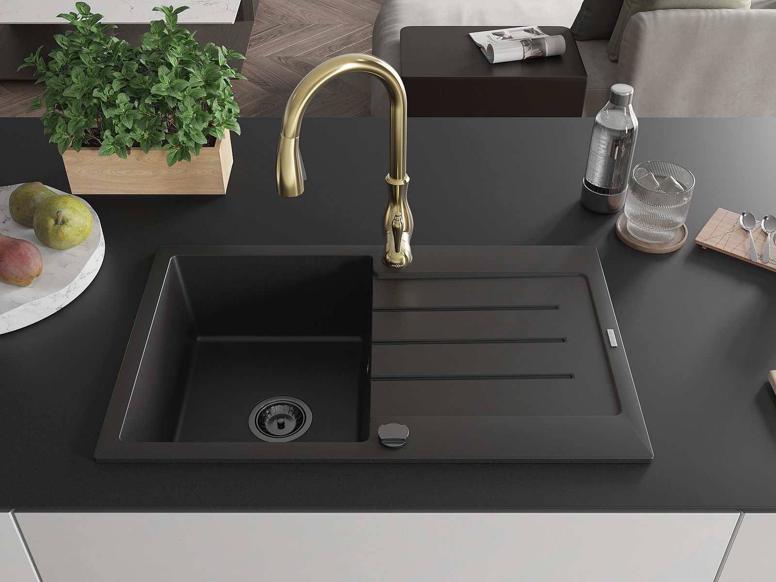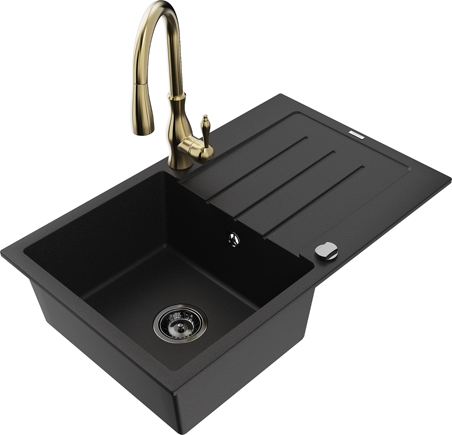 Mexen Bruno žulový drez s 1 komorou, odkvapkávacou plochou a kuchynskou batériou Savita, čierny - 6513-77-672601-50-B