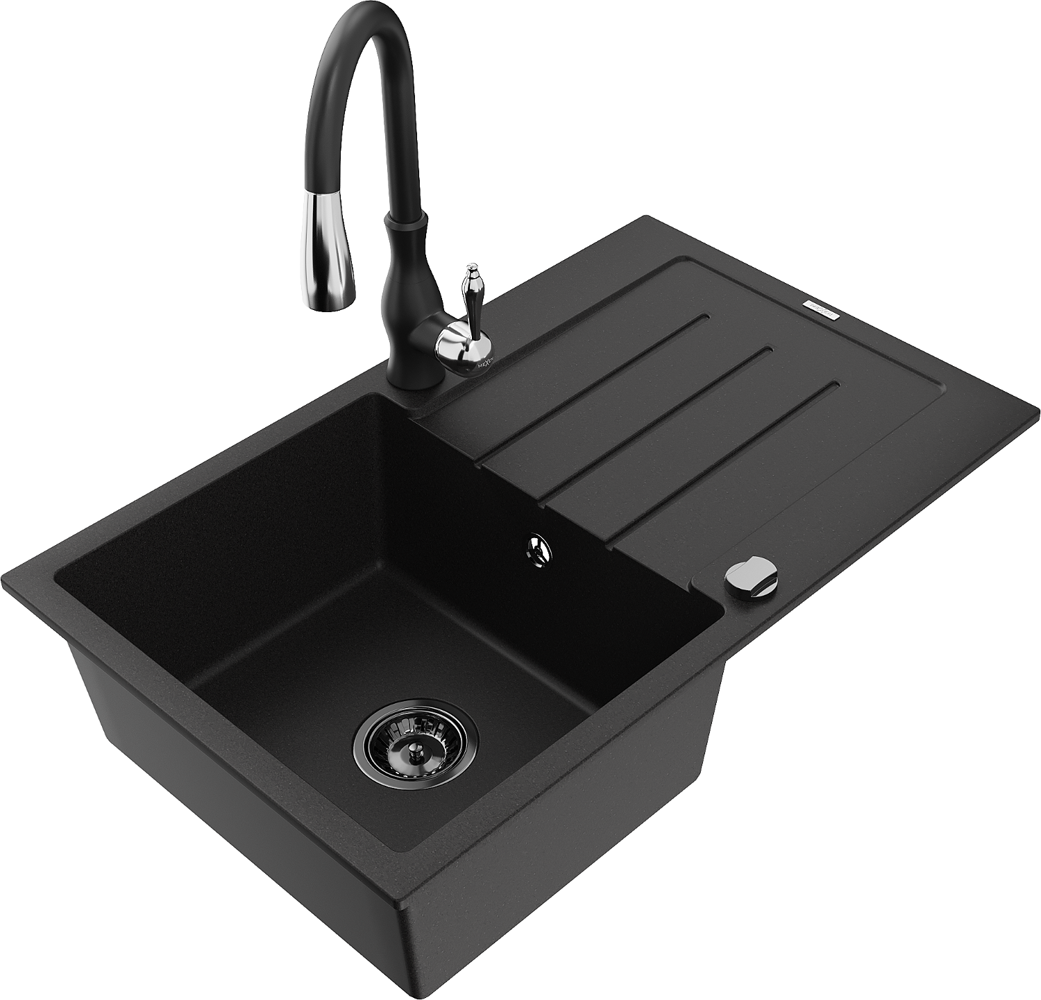 Mexen Bruno žulový kuchynský drez s 1 komorou a odkvapkávačom a kuchynskou batériou Savita, čierny - 6513-77-672601-70-B