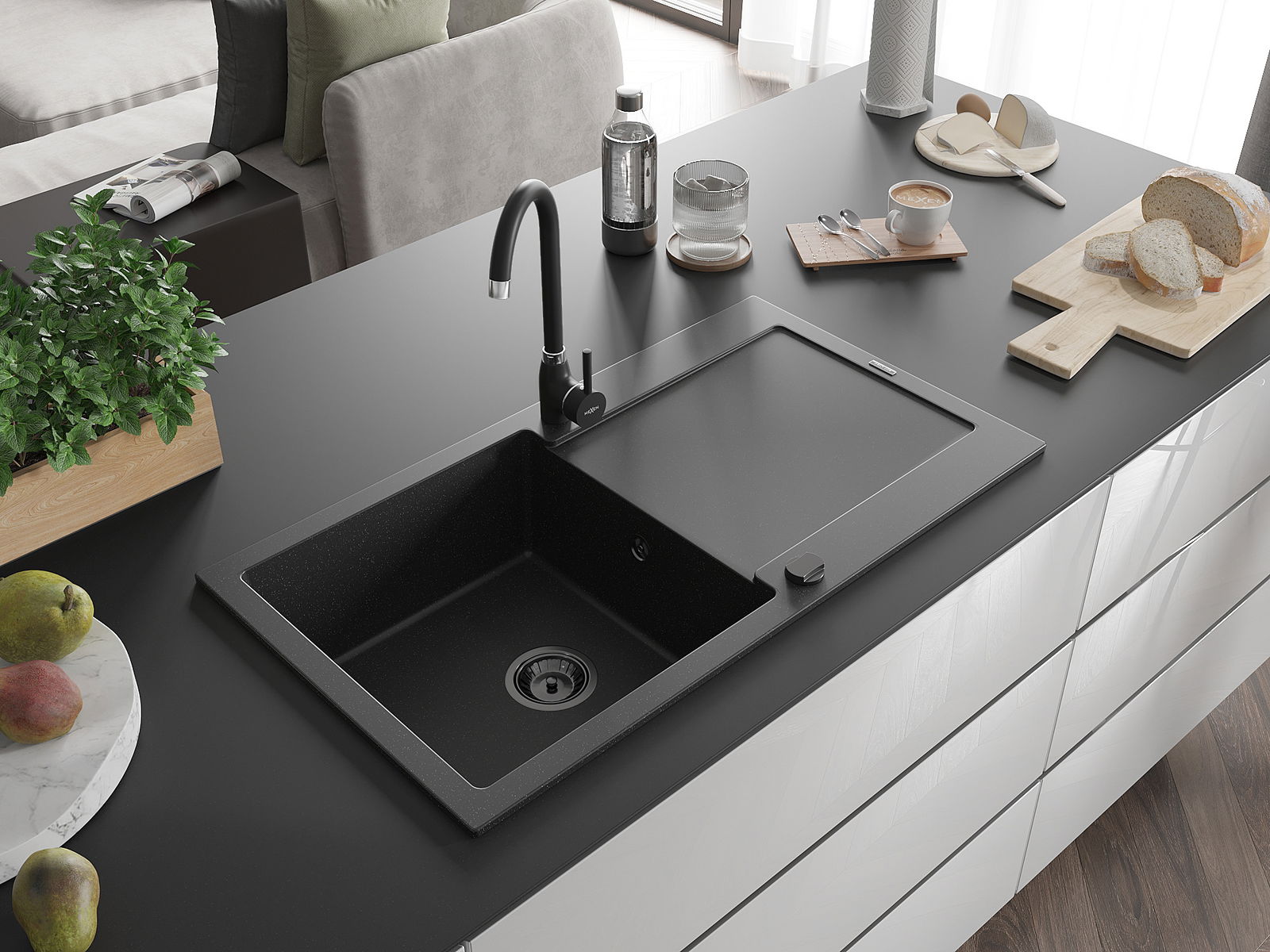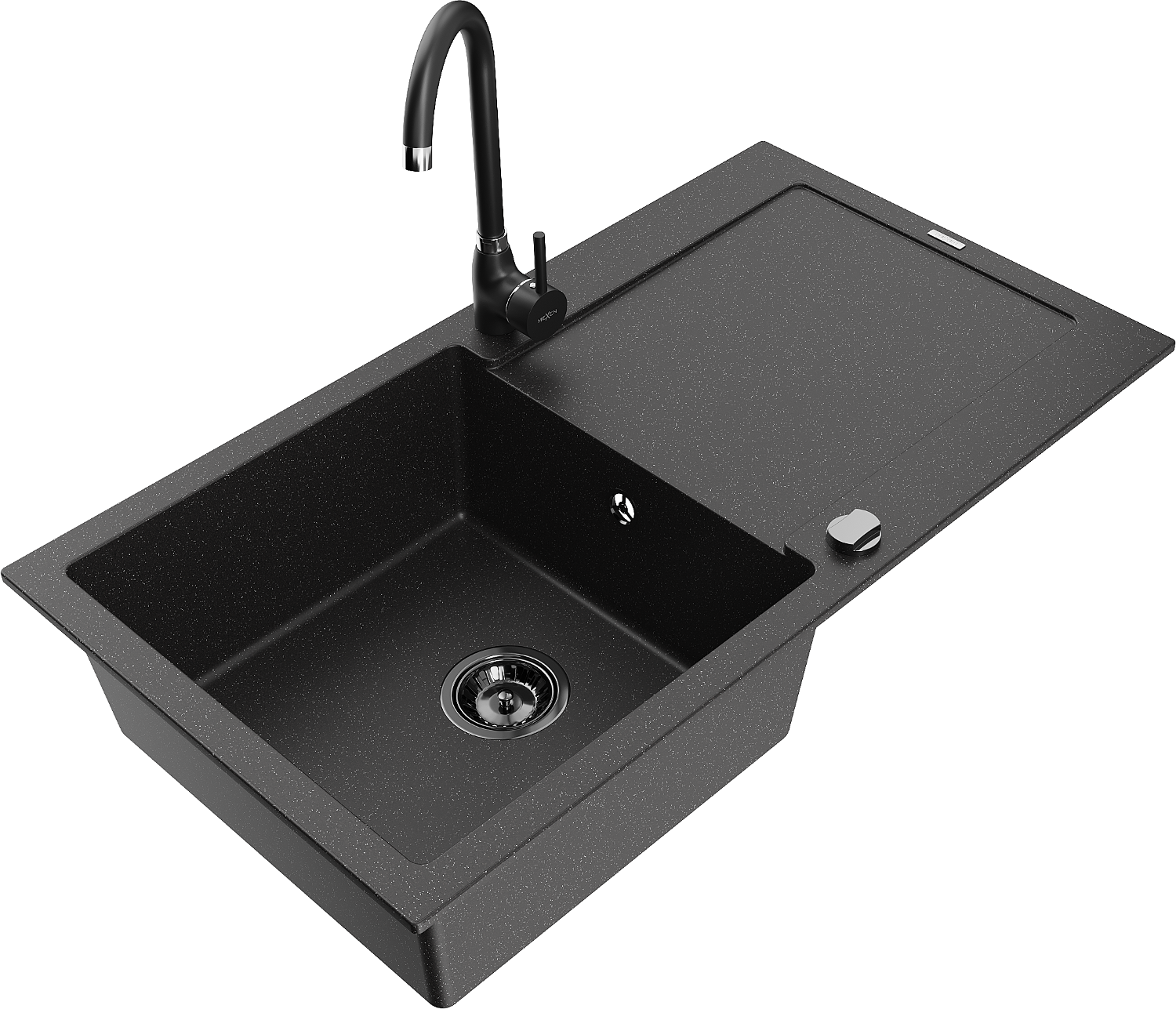 Mexen Leo granitový kuchynský drez s 1 komorou s odkvapkávačom a kuchynskou batériou Telma, čierny/strieborný metalický