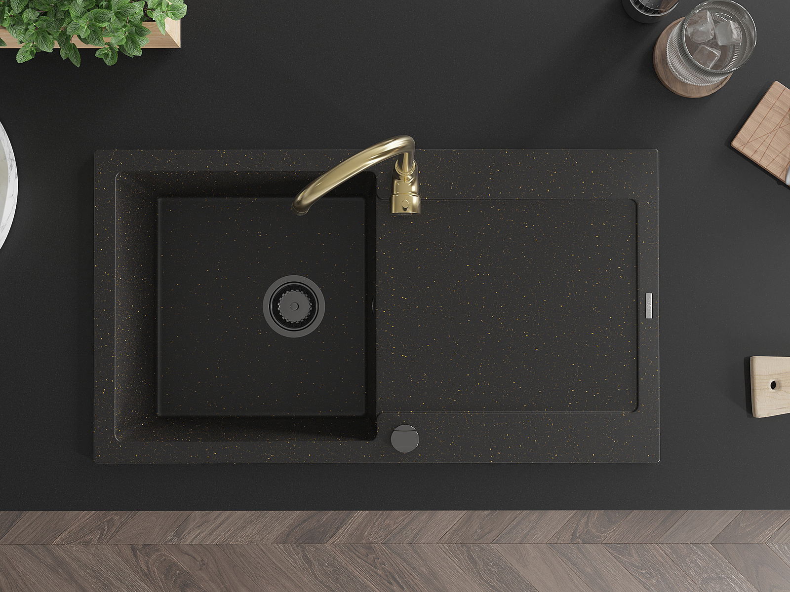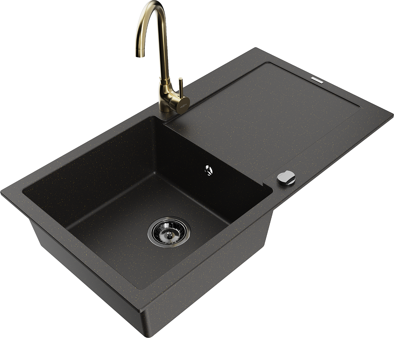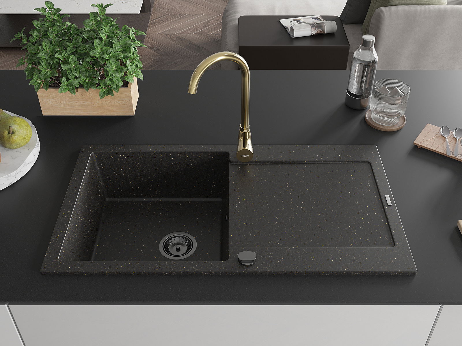 Mexen Leo žulový drez 1-komorový s odkvapkávačom a kuchynskou batériou Telma, čierny/zlatý metalik - 6501-75-670200-50-B