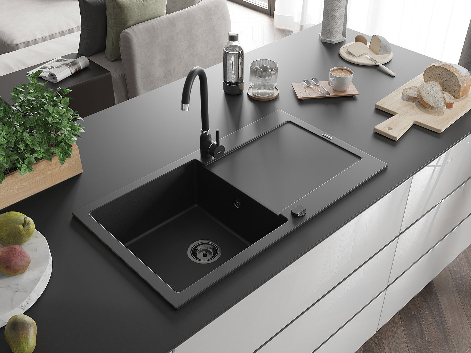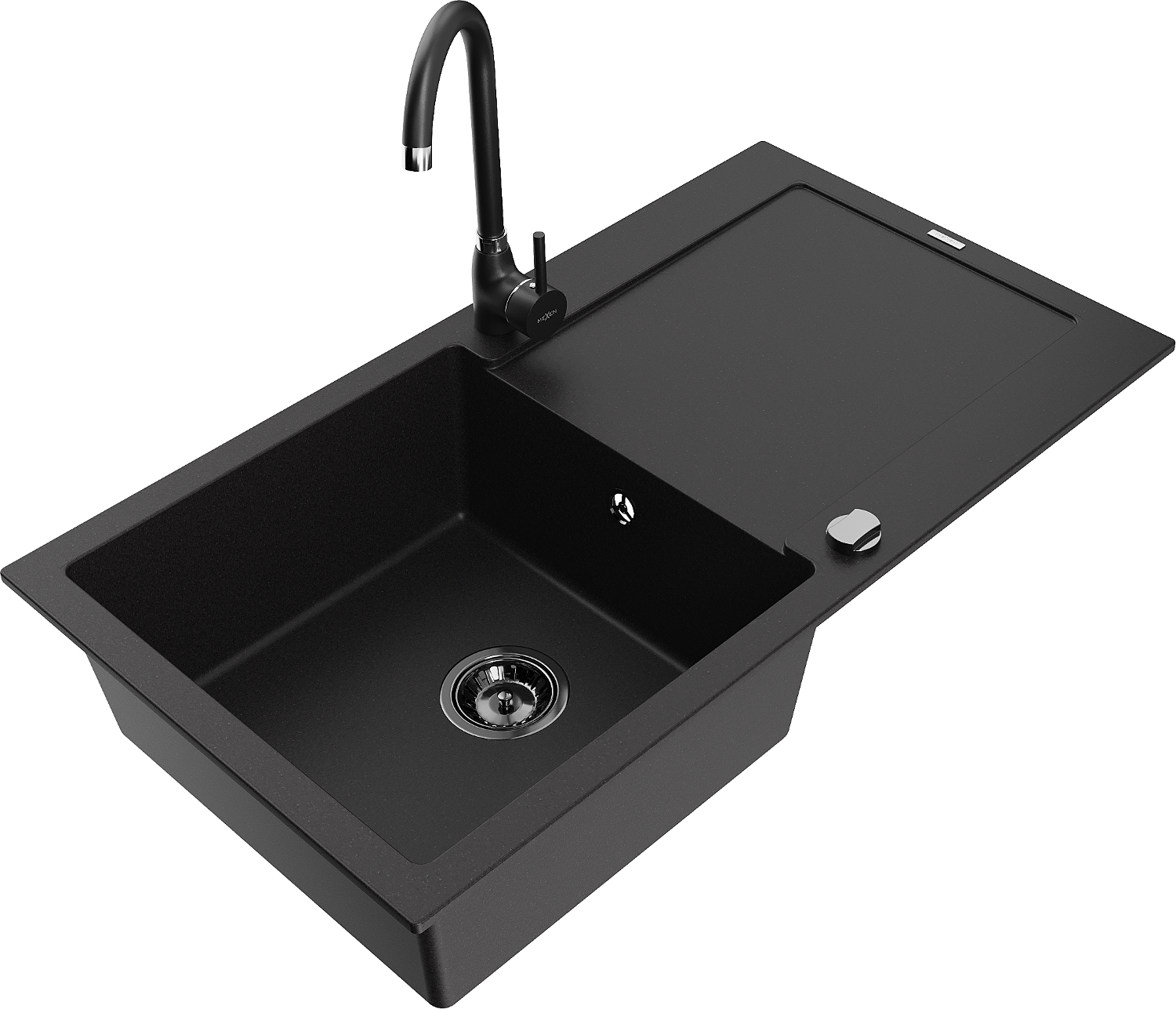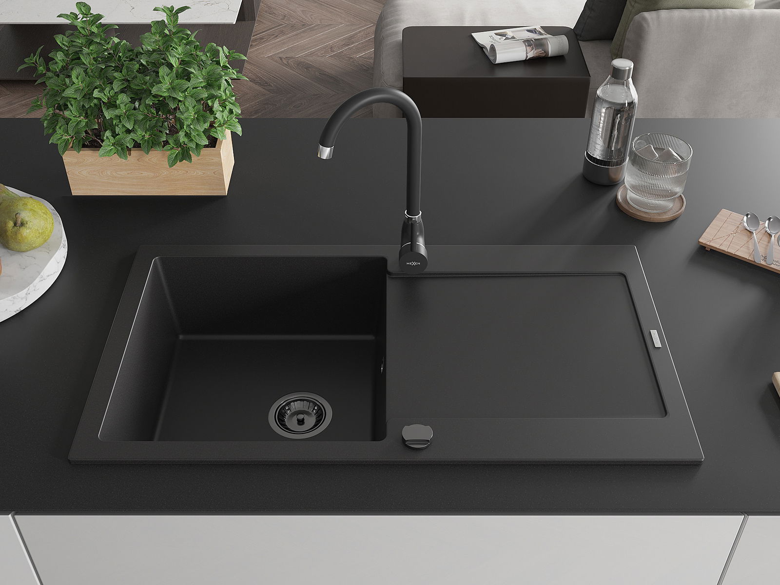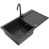 Mexen Leo žulový drez 1-komorový s odkvapkávačom a kuchynskou batériou Telma, čierny - 6501-77-670200-70-B