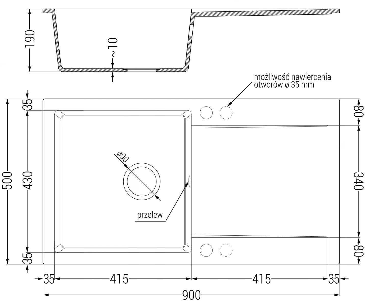 Drez má 2 predfrézované otvory s priemerom 35 mm, ktoré si môžete vlastnoručne vyraziť. Môžete ich využiť napríklad na montáž dávkovača na tekutinu, ktorý eliminuje prítomnosť plastových fliaš v kuchyni a dodá jej elegantný vzhľad.
