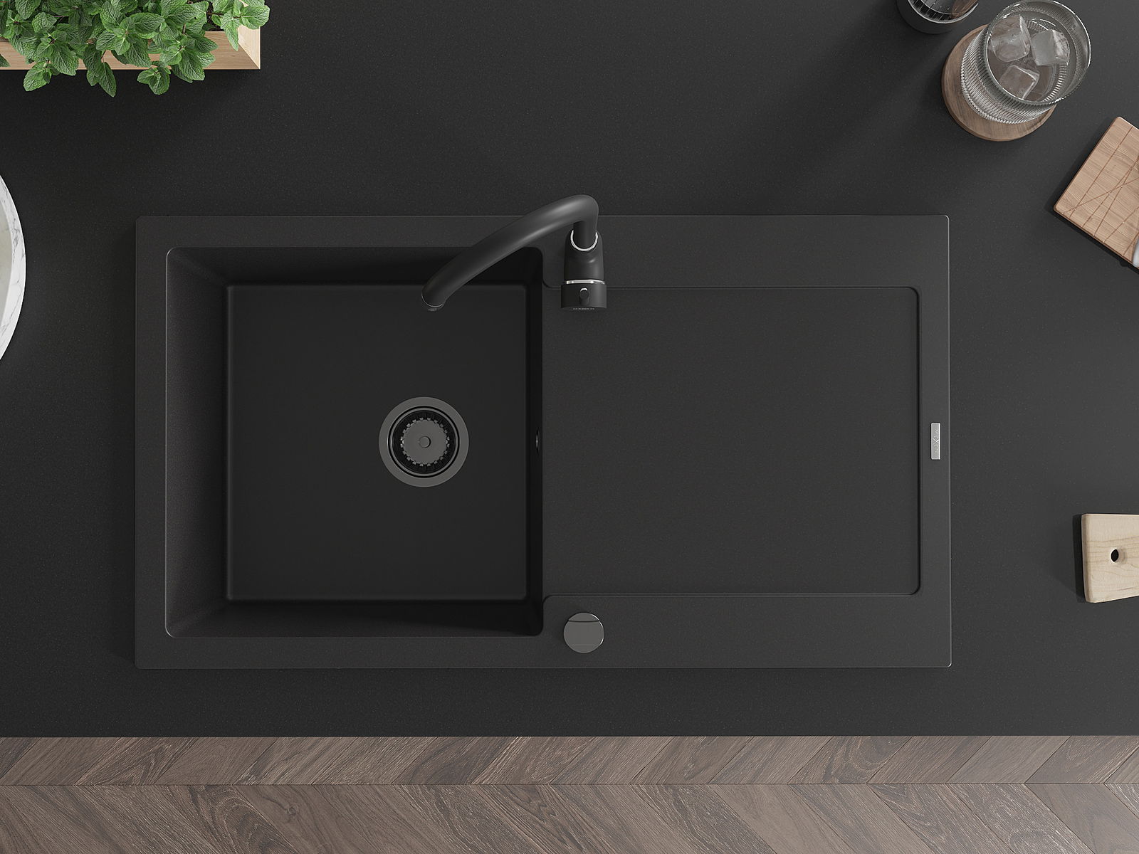 Povrch kuchynského drezu je odolný voči škvrnám a zafarbeniu, vďaka čomu sa ľahko udržiava a zachováva svoju farbu počas dlhého obdobia používania. Estetický a praktický doplnok pre každú kuchyňu.